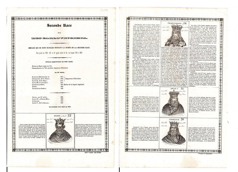 Rappresentazione dei Re di Francia "Seconde Race" con ai lati la descrizione, su due facciate avanti e retro dal 23° al 26°: Pepin le Bref, Charlemagne, Louis I°, Charles II,Inserita nell'opera "Histoire de la France, Depuis Pharamond jusqu'à Louis Philippe 1.er (420 - 1842) Par J. Henry, maitre de pension, Géomètre de primièr classeet Imprimeur litographe" edita dall'Autore Alexandre Corbin Litografo ed editore a Tours nel 1842