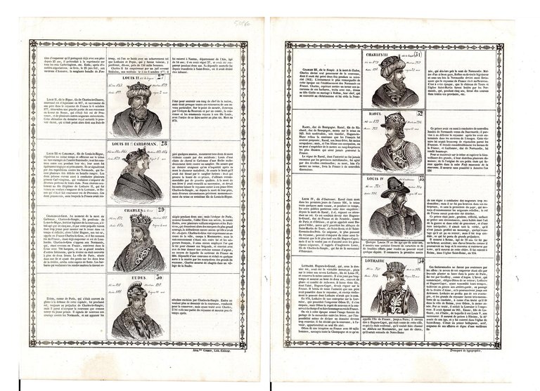 Rappresentazione dei Re di Francia "Seconde Race" con ai lati la descrizione, su due facciate avanti e retro dal 23° al 34°: Louis II dit le begue, Louis III et Charloman, Charles le Gros, Eudes, Charles III, Raoul, Louis IV, Lothaire.Inserita nell'opera "Histoire de la France, Depuis Pharamond jusqu'à Louis Philippe 1.er (420 - 1842) Par J. Henry, maitre de pension, Géomètre de primièr classeet Imprimeur litographe" edita dall'Autore Alexandre Corbin Litografo ed editore a Tours nel 1842