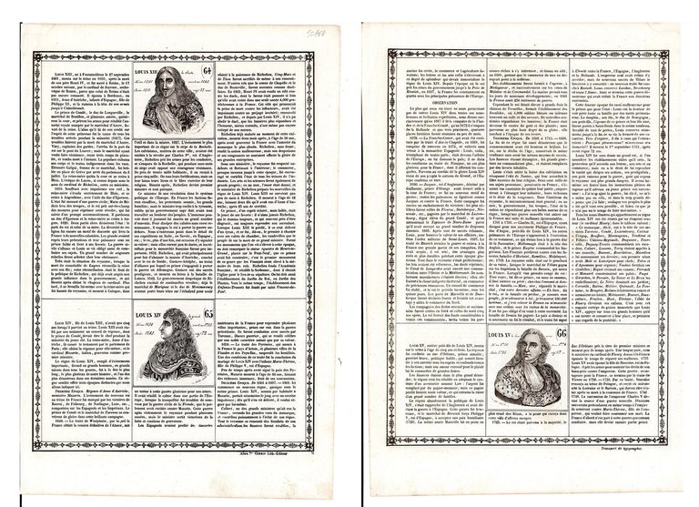 Rappresentazione dei Re di Francia "Cinqième dite des Boubons" con ai lati la descrizione, su due facciate avanti e retro dal 64° al 66°: Louis XIII le Juste, louis XIV le grand, Louis XV le bien aimé.Inserita nell'opera "Histoire de la France, Depuis Pharamond jusqu'à Louis Philippe 1.er (420 - 1842) Par J. Henry, maitre de pension, Géomètre de primièr classeet Imprimeur litographe" edita dall'Autore Alexandre Corbin Litografo ed editore a Tours nel 1842