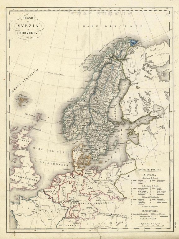 Carta geografica, antica ed originale con coloritura coeva ai confini. Autore: Marieni Giovanni trad. & A. Campana dir. Luogo: Scandinavia. Anno: 1833. Tecnica: incisione in rame. Dimensioni: 390x288. Milano, dall’Imperiale Regia Stamperia