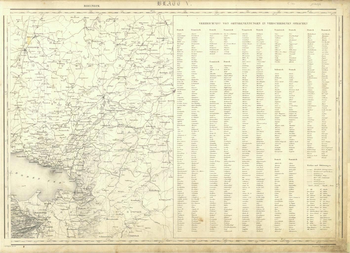 Carta topografica molto particolareggiata (Tav. V) del territorio nei dintorni del lago di Costanza sponda est. e molteplici rimandi di città, monti, ghiacciai, laghi, ecc. La mappa del Dufour è basata sulle misurazioni dei cantoni e della Confederazione svizzera e fu costruita negli anni 1845 al 1865 dall'Ufficio Topografico Federale Svizzero sotto la guida di Guillaume Henri Dufour. Le riprese e gli studi originali di questa carta del Dufour furono disegnati in scala 1:25 000 (per la pianura) e 1:50 000 (per le montagne). La pubblicazione è stata edita in scala 1:100 000, per cui il territorio della Svizzera venne realizzato su 25 fogli. Il terreno montuoso venne disegnato, in particolare nella carta del Dufour, con ombre particolari che danno il senso dell’altezza. Questo cosiddetto "stile svizzero" ha ricevuto negli anni del XIX secolo un sacco di elogi e portato l'Ufficio Topografico Federale Svizzero a diversi riconoscimenti internazionali. Autore: Dufour G. H. diresse & Bressanini e Mullhaupt sculp. Luogo: Rheineck. Anno: 1850. Tecnica: incisione in rame. Dimensioni: 500x720 ca. Telatura coeva con segni di usura