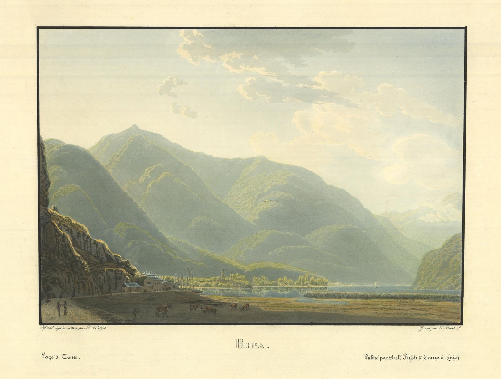 “la partie supérieure et la plus petite du lac de Côme qui, près de Ripa, prend son commencement et qu’on nomme ici improprement le lac de Chiavenna. Le hameau Ripa ne consiste qu’en auberges et cabanes de pêcheurs, qui occupent le premier plan de la gauche de notre planche. Après Ripa suit le petit village Novale, puis Vercelli et Celerate […] Les montagnes qui entourent ce petit lac sont couvert, pour la plus grande partie, de sombres châtaigneraies. Il n’y a que cà et là des maisons isolées et des chapelles, et la nature porte presqu’entièrement un caractère sombre et uniforme” (Voyage pittoresque au Lac de Come, 1822). Ottimo lo stato di conservazione generale.