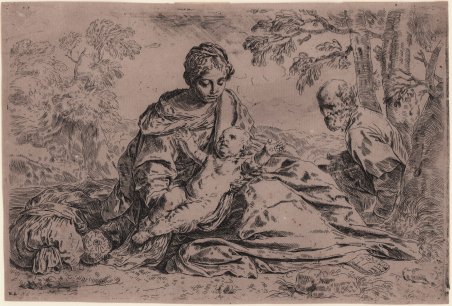 Acquaforte, circa 1650, priva di dati editoriali. Da un soggetto di Simone Cantarini. Magnifica prova, ricca di toni, impressa su carta vergata coeva con filigrana “giglio nel cerchio”, rifilata al rame, in ottimo stato di conservazione. L'opera deriva dall'incisione del Cantarini, della quale è una fedele e coeva replica, molto ingannevole. Probabile che si tratti di un lavoro di scuola. Ex collezione Martin-von-Wagner-Museum der Universität Würzburg (Lugt 2541 C). Magnifica tiratura. Etching, circa 1650, without signature. After Simone Cantarini. A fine impresison, printed on contemporary laid paper with “encircled fleur de lys” watermark, trimmed to the paltemark, very good conditions. A close copy of the Pesarese's etching. Ex collezione Martin-von-Wagner-Museum der Universität Würzburg (Lugt 2541 C). Cfr. Bartsch 30; Bellini 30A.
