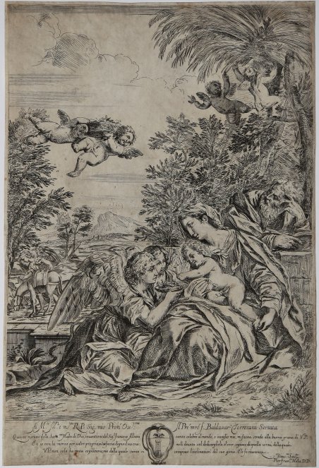 Acquaforte e bulino, 1640 circa, firmato in basso a destra, al termine della dedica “Pierfran.co Mola D.D.” Da un dipinto di Francesco Albani.Bell’esemplare, impresso su carta vergata coerva, rifilato alla linea marginale, sporadiche fioriture, nel complesso in buono stato di conservazione.Come l’incisore dichiara nella dedica a Baldassare Torresani, la composizione deriva da un dipinto di Francesco Albani. Secondo il Bartsch la lastra sarebbe stata terminata da un altro incisore, anonimo e meno capace del Mola., che aggiunse l'angelo che conduce l’asino e la metà inferiore dell'ala dell'angelo più vicino all'osservatore. Engraving and etching, 1640 circa, inscribed with dedication and signed: ' Al M.to Ill.e e m.to R. P. Sig. mio Pron Oss.mo // Il P. re mro f. Baldassa Torresani Seruita [.] Pier fran.co Mola D.D.'Good example, printed on contemporary laid paper, trimmed close to platemark, occasional foxing, generally in good condition.After a painting by Francesco Albani last documented in the Yarborough Collection, Brocklesby Park.According to Bartsch, the angel leading the donkey was engraved later by an anonymous artist. Cfr. Bartsch XIX.204.4; D'Amico and Bellini 1978, no. 16