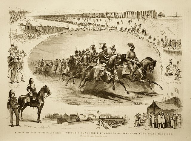 Rivista militare di Vigonza: 6 aprile.- Vittorio Emanuele e Francesco Giuseppe col loro stato maggiore