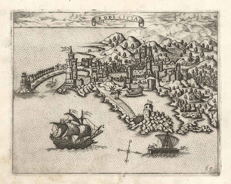 Veduta della città di Rodi, nell'omonima isola del mar Egeo. Secondo stato edito da Donato Bertelli ed inserito nel suo "Isolario". L'aggiunta della numerazione nell'angolo in basso a destra permette l'identificazione dell'edizione; questa nacque dalla modifica dei rami originali di Camocio che erano stati acquistati dal Bertelli dopo la scomparsa del Camocio stesso durante l'epidemia pestilenziale che colpì la città di Venezia. Impressione marcata e vivace, ottimo lo stato di conservazione.