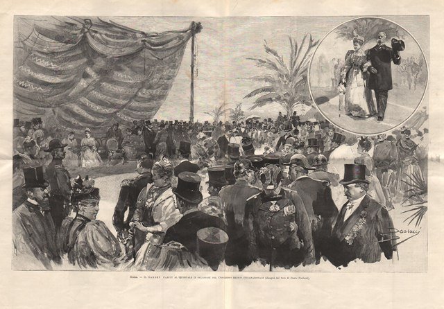 Veduta dei festeggiamenti al Quirinale del 2 aprile, in occasione del Congresso Medico Internazionale. Nel tondo l’arrivo di re Umberto I (Torino 1844 - Monza 1900) e la regina Margherita di Savoia (Torino 1851 - Bordighera 1926). Pieghe editoriali.Testo al retro
