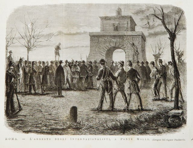 Stampa, antica ed originale, con raffigurato l'arresto degli Internazionalisti a Ponte Molle. Testo al retro