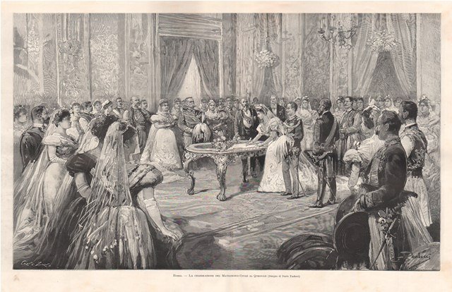 Veduta interna della matrimonio civile al Quirinale tra Vittorio Emanuele III di Savoia (Napoli 1869 - Alessandria d'Egitto 1947) e Elena del Montenegro (Cettigne 1873 - Montpellier 1952) avvenuto il 24 ottobre 1896: la cerimonia religiosa si tenne nella Basilica romana Santa Maria degli Angeli. Piega editoriale. Testo al retro