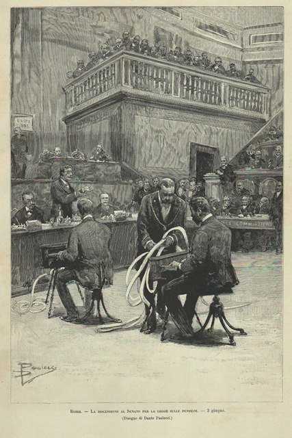 Veduta della seduta del 3 giugno durante la discussione sulle pensioni civili e militari. Al centro gli stenografi al lavoro mentre l’inserviente raccoglie le strisce. Testo al retro