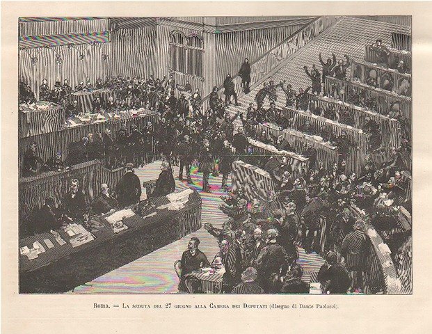 Veduta tumultuosa della seduta del 27 giugno 1891 a Palazzo Montecitorio. Testo al retro