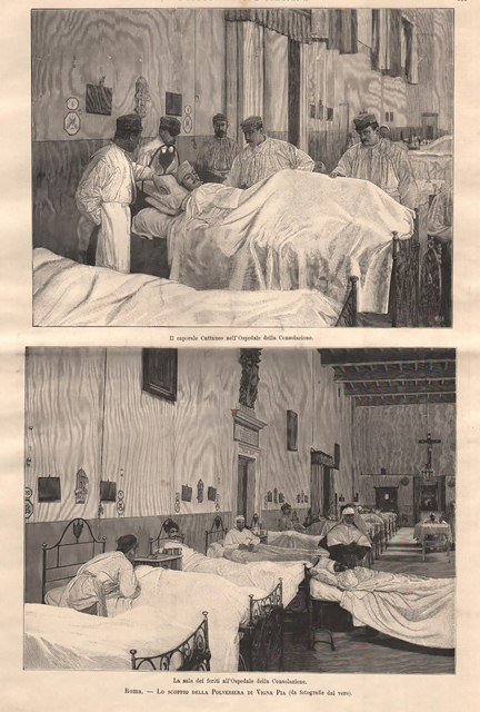 Due vedute in unico foglio mostrano i feriti all’ospedale dopo l’esplosione avvenuta il 23 aprile: in alto il caporale Cattaneo all’Ospedale di Santa Maria della Consolazione. Testo al retro