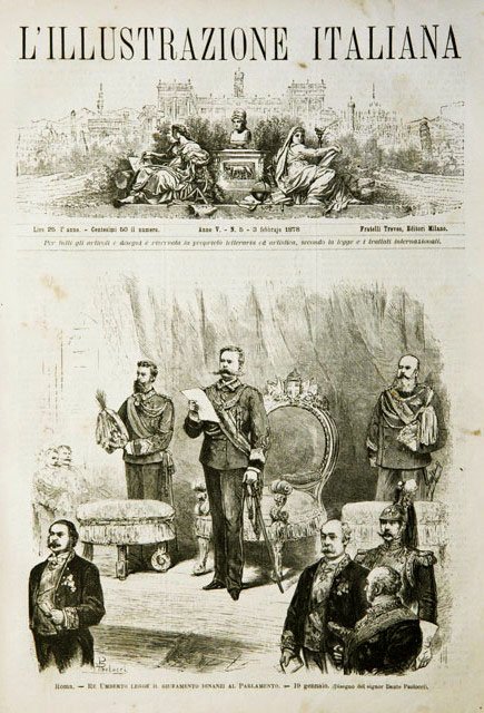 Roma.- Re Umberto legge il giuramento dinanzi al Parlamento.- 19 gennaio