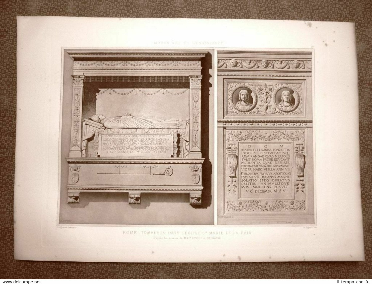 Grande eliografia stampata su cartoncino speciale Roma Tombe nella Chiesa di Santa Maria della Pace LITOGRAFIE - 785 Dimensioni Cm 45,00 x 32,00 Estratta da "Fragments D'Architecture du Moyen Age et de la Renaissance d'apres les Releves & Restaurations des Anciens Pensionnaires de l'Academie de France a Rome". Incisore: Lemercier. Autore: D'Espouy Hector. Pubblicata da Charles Schmid in Parigi nel 1897. Paypal Carta di credito Bonifico bancario Spedizione con posta ordinaria o raccomandata scelta dall'Acquirente nel momento del pagamento Clicca qui per accedere al nostro Store ed al suo sterminato archivio