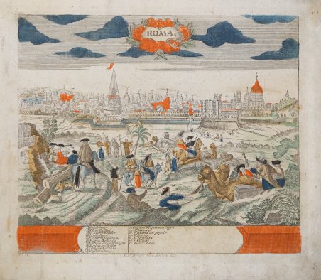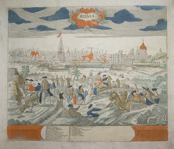 Rara veduta panoramica della città edita dagli eredi di Jeremias Wollf ad Augsburg. La stampa, corredata da una legenda di 17 voci, mostra numerosi personaggi e animali sul primo piano. Il Tevere segue l'errato corso tipico di tutte le vedute della città di produzione nordica, tuttavia in questa incisione gli edifici sono disegnati in maniera molto più realistica e corrispondente al vero. Il prototipo iniziale per questa tipologia di panorami è identificabile nella veduta generale incisa da Israel SIlvestre nel 1642.Incisione in rame, coloritura coeva, in ottime condizioni. Rare panorama of the city edited by the heirs of Jeremias Wollf in Augsburg. ' The print, accompanied by a 17-item key-legend, shows numerous characters and animals in the foreground. ' The Tiber follows the wrong course typical of all city views of Nordic production, but in this engraving the buildings are drawn in a much more realistic way and correspond to reality. The initial prototype for this type of panorama can be identified in the general view engraved by Israel SIlvestre in 1642. Copper engraving, contemporary coloring, in very good condition. Cfr. C. Marigliani, "Le Piante di Roma delle collezioni private", tav. 105.