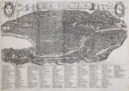 Pianta prospettica di Roma incisa da Wolfgang Kilian ' (1581–1662) per il Ioannis Henrici à Pflaumern IC Mercurius italicus. stampato a Auguste Vindelicorum: typis Andreae Apergeri, nel 1625. Si tratta di una prima derivazione della pianta della città di Roma delineata ed incisa da Antonio Tempesta (1593). “In alto a sinistra lo stemma di Urbano VIII Barberini (1623-1644) ed a destra quello del Comune di Roma (SPQR). In basso 182 numeri di legenda. È una delle prime riduzioni della pianta del Tempesta, senza alcun aggiornamento rispetto al prototipo se non per la raffigurazione di ponte Santa Maria che appare "rotto" a seguito della piena del 1598” (cfr. C. Marigliani, Le Piante di Roma nelle collezioni private, p. 180, n. 83). Bellissima prova, impressa su carta vergata coeva, consuete pieghe di carta, per il resto in buono stato di conservazione. Bibliografia Scaccia Scarafoni n. 184; C. Marigliani, Le Piante di Roma nelle collezioni private, p. 180, n. 83. Perspective map of Rome engraved by Wolfgang Kilian (1581-1662) for the Ioannis Henrici à Pflaumern IC Mercurius italicus. printed in Auguste Vindelicorum: typis Andreae Apergeri, in 1625. This is an early derivation of the plan of the city of Rome outlined and engraved by Antonio Tempesta (1593). "On the upper left the coat of arms of Urban VIII Barberini (1623-1644) and on the right that of the Municipality of Rome (SPQR). Bottom 182 numbers of legend. This is one of the earliest reductions of Tempesta's plan, with no update to the prototype except for the depiction of Ponte Santa Maria, which appears "broken" as a result of the 1598 flood" (cf. C. Marigliani, Le Piante di Roma nelle collezioni private, p. 180, no. 83). Beautiful proof, printed on contemporary laid paper, usual paper creases, otherwise in good condition. Bibliografia Scaccia Scarafoni n. 184; C. Marigliani, Le Piante di Roma nelle collezioni private, p. 180, n. 83. Cfr.