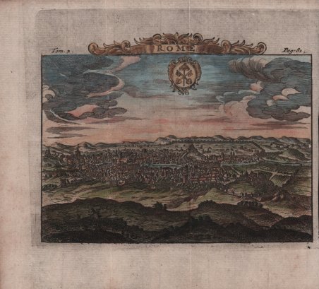 Veduta tratta dal "Les delices de l'Italie, contenant une description exacte du Païs, des principales villes, de toutesa les Antiquitez" edito, per la prima volta, a Leida nel 1706 da Pieter Vander Aa e successivamente ristampato a Parigi da Guillaume Cavelier. La maggior parte delle copie della seconda edizione reca nel frontespizio l'indicazione Compagnie des libraires, associazione di librai stampatori la cui composizione è variata negli anni ma di cui Guillaume Cavelier faceva parte.La guida, che sappiamo da Barbier I, 872 essere opera di Rogissart e dell'abate Havard, è impreziosita da 152 tavole,Acquaforte, finemente colorata a mano, in ottimo stato di conservazione. Bibliografia Marigliani (2007): p. 259, n. 169. Panorama of Rome taken from "Les delices de l'Italie, contenant une description exacte du Païs, des principales villes, de toutesa les Antiquitez"published for the first time in Leiden in 1706 by Pieter Vander Aa and later reprinted in Paris by Guillaume Cavelier. Most copies of the second edition bear on the title page the indication Compagnie des libraires, an association of booksellers-printers whose membership has varied over the years but to which Guillaume Cavelier belonged. The guide, which we know from Barbier I, 872 to be the work of Rogissart and Abbot Havard, is embellished with 152 plates, Copperplate engraving with fine later hand colouring, in good condition. Bibliografia Marigliani (2007): p. 259, n. 169. Cfr.