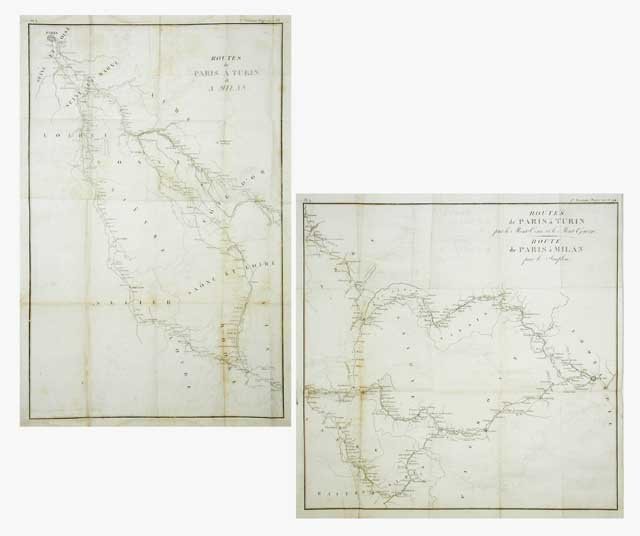 Carta geografica schematizzata, raffigurante le strade di collegamento tra Parigi, Milano e Torino. In due fogli