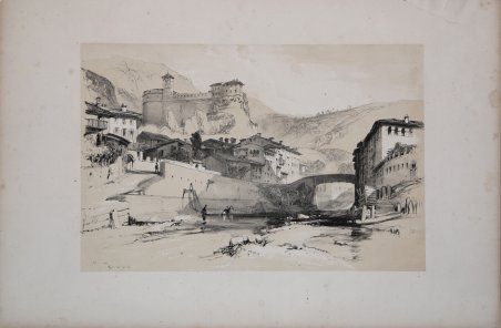 Veduta tratta da Sketches at home and abroad, di James Duffield HARDING (1798-1863), pubblicato a Londra da Charles Tilt, 1836. “This book represents something of a landmark in the history of the lithograph in that it may be said to initiate the series of tinted lithographs, which . were to dominate the market for many years, reaching a peak of ambitious bulk in Roberts’s Holy Land, 1842–9” (Abbey). L’opera venne pubblicata stampata su carta litografica in “folio imperiale”; conteneva cinquantuno litografie a tinta unica (incluso il frontespizio), tutte disegnate da James Harding. Le viste includevano scene di Gran Bretagna, Francia, Monaco, Italia e Germania. I disegni originali furono realizzati in un periodo compreso tra il settembre 1824 e l'ottobre 1835, ma molti risalgono al 1834, quando J. D. Harding fece un lungo tour continentale. Non si sa quando i disegni furono tradotti a stampa, ma presumibilmente qualche tempo dopo l'ottobre 1835. Furono stampati da Hullmandel e pubblicati da Charles Tilt in un'edizione limitata di 1.000 esemplari. Le litografie di questo lavoro conferirono a James Duffield Harding una solida reputazione, sia in Inghilterra sia nel continente. In effetti, per il suo lavoro Sketches at Home and Abroad, l'artista venne insignito con un anello di diamanti del re Louis-Phillipe di Francia. ' Litografia tinta, in ottimo stato di conservazione. View of the town, taken from Sketches at home and abroad., London: Charles Tilt, [1836] by Harding. “This book represents something of a landmark in the history of the lithograph in that it may be said to initiate the series of tinted lithographs, which . were to dominate the market for many years, reaching a peak of ambitious bulk in Roberts’s Holy Land, 1842–9” (Abbey). Sketches at Home and Abroad was published as a set of imperial folio size and contained in total fifty-one original plates of single tinted lithographs (including the title page), all drawn on the stone by James Harding. The views included scenes of Britain, France, Monaco, Italy and Germany. The original drawings were made over a period from September 1824 to October 1835, but many date from 1834 when J. D. Harding made an extensive continental tour. It is not known when the drawings were put on stone, but presumably some time after October, 1835. They were printed by Hullmandel and published by Charles Tilt in an edition of 1,000 copies, after which the drawings were then effaced from the stones. The lithographs from this meticulously made set gained for James Duffield Harding a strong reputation, both in England and on the continent. In fact, for his work dealing with Sketches at Home and Abroad the artist was presented with a diamond ring from King Louis-Phillipe of France. Tinted litograph, in perfect condition. ' Cfr. Abbey Travel 29; Cremonini 126; RIBA 1465.