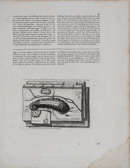 L'imbarazzo nel descrivere il soggetto è pari a ll'estro ed alla follia artistica ed intellettuale del Piranesi, sintetizzato in questa "vignetta" dalla forma curiosa ma inequivocabile!Rarissima opera a sfondo satirico e polemico,inserita a pagina 35 della sola prima edizione di "Diverse Maniere d'adornare i Cammini ed ogni altra parta degli edifizi", edita a Roma dal Piranesi nel 1769. Esattamente l'opera è collocata alla fine dell'Apologia in difesa dell'architettura degli Egiziani e Toscani, realizzata in aperta polemica con Bertrand Capmartin de Chapuy, autore di un testo archeologico sulla villa di Orazio dal titolo "Decouverte de la maison de campagne d'Horace" stampato tra il 1767 ed il 1769.Continuanado l'aperta polemica con la cosidetta "archeologia dotta", il Piranesi nella sua Apologia che precede questa incisione, continua e rafforza il discorso già intraprese con le "Antichità Romane".I tre volumi raffigurati danno vita ad in effetto trompe oeil; il nome del Capmartin de Chapuy è riportato su uno dei tre tomi, con altri che invece riportano frasi pungenti indirizzate allo stesso ("Non merita risposta", "Capo confuso"). Il tutto viene arricchito dalla frase "Una fonte secca e pochi muri hanno prodotto tre grossi tomi". In basso, l'autore si prende cura di consigliare l'editore con l'iscrizione "Via avverto a prender consiglio prima di stampare".Acquaforte e bulino, 1769. Magnifica prova, impressa su carta vergata coeva con filigrana "doppio cerchio e giglio con lettere CB" (Robison 37), con pieni margini, lieve gora d'acqua nella parte inferiore destra del margine bianco, in eccellente stato di conservazione. The embarrassment in describing the subject is equal to all the Piranesi's artistic and intellectual inspiratrion, summarized by this "vignette" with a curious but unmistakable shape!Very rare work, with a satirical and polemical insiration, inserted on page 35 of the only first edition of "Diverse Maniere d'adornare i Cammini ed ogni altra parta degli edifizi, published in 1769 in Rome.Exactly the work is located at the end of the Apologia in difesa dell'architettura degli Egiziani e Toscani, made in open dispute with Bertrand de Capmartin Chapuy, author of a text on archaeological villa of Horace entitled "Decouverte de la maison de campagne d 'Horace" and printed between 1767 and 1769.Continuing the open dispute with the so-called "scholarly archeology", Piranesi in his Apologia which comes before this print, keeps on and intensifies the thesis which he initiated with the "Antichità Romane".The three depicted volumes give rise to a trompe l'oeil effect; the name of Capmartin de Chapuy is shown on one of the three volumes, with a few monking sentences directd towards him as :"Non merita risposta" & "Capo confuso" ("He does not deserve response" & "Cape confused"). These are enriched by the iscription "Una fonte secca e pochi muri hanno prodotto tre grossi tomi" ("A source dry and few walls have produced three thick volumes").Below, the author takes care to advise the publisher with the inscription: "Via avverto a prender consiglio prima di stampare" ("I advise you to think about it carefully before printing").Etching and engraving, 1769. Magnificent proof, printed on contemporary laid paper with watermark "double circle and lily with letters CB" (Robison 37), with full margins, slight water stain at the bottom right of the white margin, in excellent condition. Cfr. Focillon 856, Witon-Ely 817