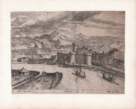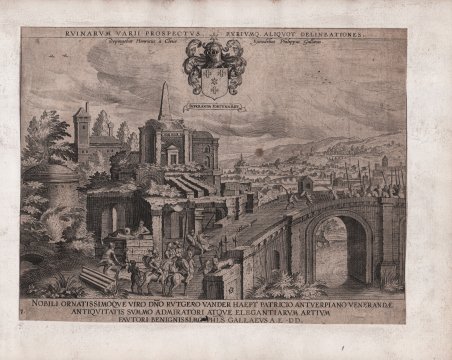 Frontespizio della raccolta ' Ruinarum varii prospectus, ruriumque aliquot delineationes ' pubblicato da Philip Galle con incisioni tratte da disegni di Hendrick van Cleve o Cliven III. Raffigura la veduta di Roma presa da Ponte Milvio. Figlio e allievo di William van Cleve, si trasferisce in Italia nella metà del XVI secolo; oltre ad un dipinto raffigurante una veduta di Roma, datato 1550, realizza un cospicuo numero di disegni che serviranno come modelli per l’opera incisa, realizzata al ritorno ad Anversa e pubblicata nel 1587. Le vedute, che raffigurano principalmente Roma ma anche altre città europee, recano in basso l’iscrizione “Henri. Cliven. inven." o "Henri Cliven pingebat" che ne attestano la derivazione ma non l'autografia. È certo che Hendrick viaggiò in Italia. Gli studiosi non sono d'accordo sui tempi del suo soggiorno, che alcuni collocano prima del 1551, anno in cui divenne maestro della Gilda, mentre altri lo collocano tra il 1551 e il 1555, data in cui si sposò. In Italia fece molti disegni di vedute di montagne, edifici e paesaggi urbani, che poi utilizzò nelle sue opere. Sulla base dei suoi disegni noti di città italiane, probabilmente trascorse del tempo a Roma, Firenze e Napoli. Hendrick van Cleve era un artista di paesaggio, creando sia vedute topografiche che paesaggi immaginari. I suoi paesaggi sono in stile italianizzante e tipicamente raffigurano ampie vedute con rovine che possono essere o meno interamente immaginarie. Le rovine sono di solito una compilazione di elementi caratteristici dell'architettura classica. Alcune sono basate su rovine esistenti che possono essere identificate, mentre altre sono costruzioni completamente di fantasia dell’artista. I disegni di Hendrik van Cleve furono quindi usati dai tipografi contemporanei di Anversa. Due serie di stampe secondo i disegni di van Cleve furono pubblicate dal famoso incisore ed editore Philips Galle. La prima serie, ' Regionem, rurium, fundormumq[ue], varii atove amoeni prospectus ' fu pubblicata nel 1587. Consiste di 10 tavole che raffigurano principalmente paesaggi pastorali immaginari con rovine. Hendrik van Cleve è menzionato come disegnatore su ogni stampa e Philip Galle come incisore. La seconda serie intitolata ' Ruinarum varii prospectus, ruriumq[ue] aliquot delineationes ' non è datata ma fu probabilmente pubblicata intorno allo stesso periodo della prima. Le 38 stampe mostrano vedute mediterranee. Non è chiaro chi abbia inciso questa serie. La firma con il monogramma di H. van Cleve appare su tutte le 38 incisioni, ad eccezione dell'incisione n. 22 della serie. Anche la firma di Philip Galle appare su tutte le incisioni mentre quella di suo figlio Theodoor appare solo su una. Anche Hendrick van Cleve stesso potrebbe essere stato l'incisore della serie. Incisione al bulino, bella impressione su carta vergata coeva, rifilata la rame e applicata su supporto di collezione, in ottimo stato di conservazione. Title page of the rare ' Ruinarum vari prospectus ruriumq. Aliquot delinationes. Showing Rome from Ponte Milvio. Hendrick van Cleve or Cliven III, son and pupil of William van Cleve, moved to Italy in the second half of the XVI century; besides a painting depicting a view of Rome (1550), he realized a considerable amount of drawing which he afterwards used as preparatory for the engravings he realized in Antwerp and published by Philip Galle in 1587. The views, whose main subject is Rome but there are also other European cities, bear the inscription “Henri. Cliven. inven" or "Henri Cliven pingebat" on lower part, which testify their origin, but not necessarily the fact that he realized them. It is certain that Hendrick travelled to Italy. Scholars disagree about the timing of his stay in Italy. Some place it before 1551, the year in which he became a master of the Guild, while others place it between 1551 and 1555, the date on which he got married. In Italy he made many drawings of mountain views, buildings and cityscapes, which he later used in his works. Based on his known drawings of Italian cities, he likely spent time in Rome, Florence and Naples. Hendrick van Cleve was a landscape artist. He created topographical views as well as imaginary landscapes. His landscapes are in the Italianising style and typically depict wide views with ruins that may or may not be entirely imaginary. The ruins are usually a compilation of characteristic elements from classical architecture. Some are based on existing ruins which can be identified. Others are completely fabricated constructions Hendrik van Cleve's drawings were used by contemporary printmakers in Antwerp as designs. Two series of prints after van Cleve's designs were published by the renowned engraver and publisher, Philips Galle. The first series, ' Regionem, rurium, fundormumq[ue], varii atove amoeni prospectus ' was published in 1587. It consists of 10 plates that mainly depict imaginary pastoral landscapes with ruins. Hendrik van Cleve is mentioned as the designer on each print and Philip Galle as the engraver. The second series entitled ' Ruinarum varii prospectus, ruriumq[ue] aliquot delineationes ' is undated but was likely published around the same time as the first one. The 38 prints show Mediterranean views. It is not clear who engraved this series. H. van Cleve's signature and monogram appear on all 38 engravings with the exception of engraving n.22 of the set which lacks the monogram. Philip Galle's signature also appears on all the engravings while that of his son Theodoor appears on engraving only. Hendrick van Cleve III may also have been the engraver as his monogram is present on the print. Engraving, good impression on contemporary laid paper, very good conditions. Cfr. Hollstein, F. W. H. Dutch and Flemish Etchings, Engravings, and Woodcuts, v.4, pl.170, n.1-38 and v.7, p.80, n.423-460