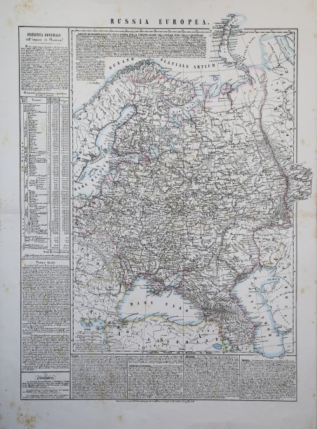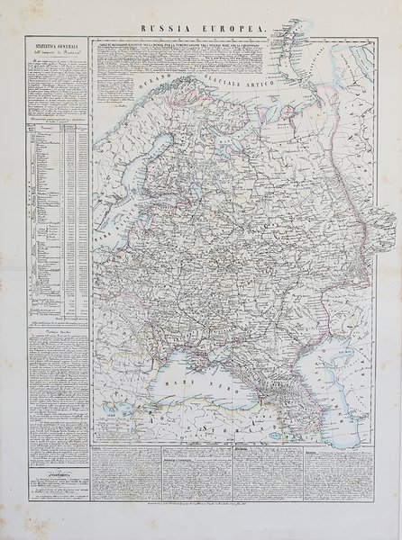 Carta geografica tratta dall’ Atlante geografico. Corredato di notizie relative alla geografia fisica politica, ed in generale alla statistica delle varie regioni del Globo. Compilato ed eseguito in litografia per cura e sotto la direzione di Benedetto Marzolla edito a Napoli nel 1858. Marzolla, autore di importanti atlanti sulle provincie del Regno di Napoli, è anche autore di diverse carte sulle ' Circoscrizioni Ecclesiastiche nel Regno delle Due Sicilie, pubblicate postume, nello stesso anno della morte (1858) a Napoli nello Stabilimento Geografico diretto da Luigi Manzella. Benedetto Marzolla fu disegnatore topografo e litografo; geografo e cartografo; membro della Commissione di statistica presso il Ministero dell'Interno. Personaggio di grandissimo rilievo nella cartografia napoletana ed italiana del XIX secolo, Marzolla ottenne in vita pubblici riconoscimenti ed attestati per la produzione cartografica di altissima qualità. La sua notorietà si è lentamente dissolta dopo la morte; va tuttavia osservato che solo la mancanza di uno spiccato coinvolgimento politico in senso risorgimentale e di una valenza letteraria nella sua opera non lo hanno reso famoso come i contemporanei Francesco Costantino Marmocchi (1805-1858) e Attilio Zuccagni-Orlandini (1783-1872), con i quali può certamente confrontarsi. I progetti culturali didattici e editoriali di Marzolla furono e rimangono di straordinaria modernità; egli inventò, è il caso di dire, un nuovo modo di intendere e di disegnare la carta geografica, fornendo una visione assolutamente originale della comunicazione dei dati geografici attraverso la combinazione di testo e immagine. Con tale operazione, egli riuscì a fondere in un'unica opera, storia, geografia, economia, statistica e cartografia, raggiungendo un equilibrio grafico di rara efficacia (cfr. V. Valerio, ' Benedetto Marzolla Brindisino, Geografo e Cartografo dell'800 Europeo, Brindisi 2008). Bell’esemplare con coloritura coeva dei contorni, in ottimo stato di conservazione. Bibliografia V. Valerio, ' Benedetto Marzolla Brindisino, Geografo e Cartografo dell’800 Europeo ' (2008), n. 86. Map taken from the Atlante geografico. Corredato di notizie relative alla geografia fisica politica, ed in generale alla statistica delle varie regioni del Globo. Compilato ed eseguito in litografia per cura e sotto la direzione di Benedetto Marzolla published in Naples in 1858. Marzolla, author of important atlases on the provinces of the Kingdom of Naples, is also the author of several maps on the Ecclesiastical Circumscriptions in the Kingdom of the Two Sicilies, published posthumously in the same year of his death (1858) in Naples in the Stabilimento Geografico directed by Luigi Manzella. Benedetto Marzolla was draftsman topographer and lithographer, geographer and cartographer. Character of great importance in the Neapolitan and Italian cartography of the nineteenth century, Marzolla obtained during his life public recognition and certificates for the production of high quality cartography. His notoriety slowly faded after his death; it should be noted, however, that only the lack of a strong political involvement in the sense of the Risorgimento and of a literary value in his work did not make him as famous as his contemporaries Francesco Costantino Marmocchi (1805-1858) and Attilio Zuccagni-Orlandini (1783-1872), with whom he can certainly compare himself. Marzolla's cultural, didactic and editorial projects were, and remain, extraordinarily modern; he invented a new way of understanding and drawing maps, providing an absolutely original vision of the communication of geographical data through the combination of text and image. With this operation, he was able to merge in a single work, history, geography, economics, statistics and cartography, achieving a graphic balance of rare effectiveness. Benedetto Marzolla is famous for being among the most important cartographers of the XIX century, for being the one to print geographic maps using high quality lithographies. His Atlante Geografico, made of 58 maps, presents finely sketched works. Six maps depict North America, among them famous map of gold diggers in California, deriving from Hippolite Ferry. Extremely relevant are also the maps of Antarctic, South Africa with the plan of Cape Town and those about Australia. Though the maps are dated between 1843 and 1856, this 1858 edition, printed in Naples at the Stabilimento Geografico Strada San Carlo (founded by Marzolla himself), represents the final version of his atlas, the last one before his death. A posthumous edition will be published in 1865. The atlas is pretty rare, is not actually listed in Phillips, British Library e OCLC. Bibliografia: Valerio, Benedetto Marzolla. Brindisino, Geografo e Cartografo dell’800 Europeo, n. 86; Tooley,s Dictionary, p. 216. Cfr.