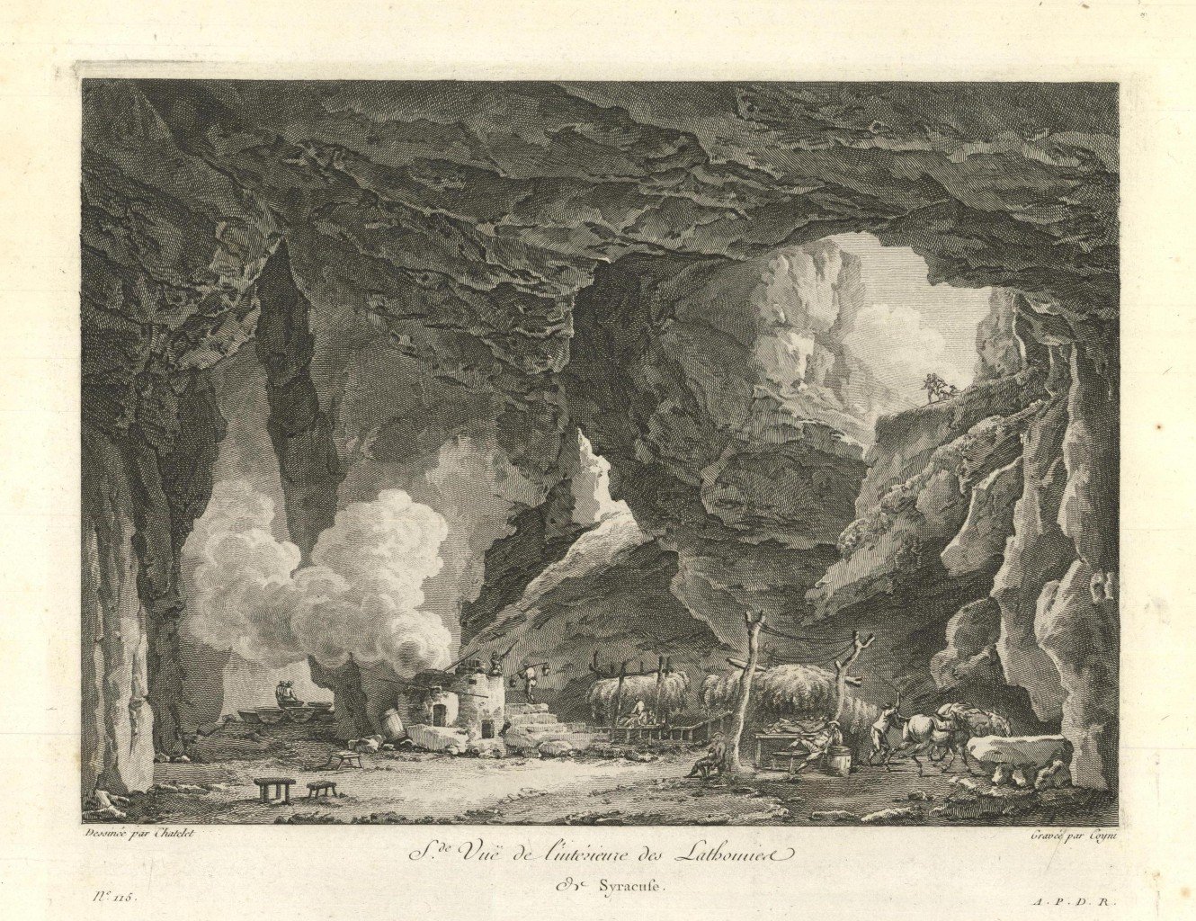 Veduta dell'interno di una grotta. Tratta dalla prima edizione della monumentale opera edita da Jean-Claude Richard de Saint-Non, meglio noto come Abate di Saint-Non " Voyage ou Description des Royaumes de Naples et de Sicilie ". Pubblicata a Parigi dal 1781 al 1786.