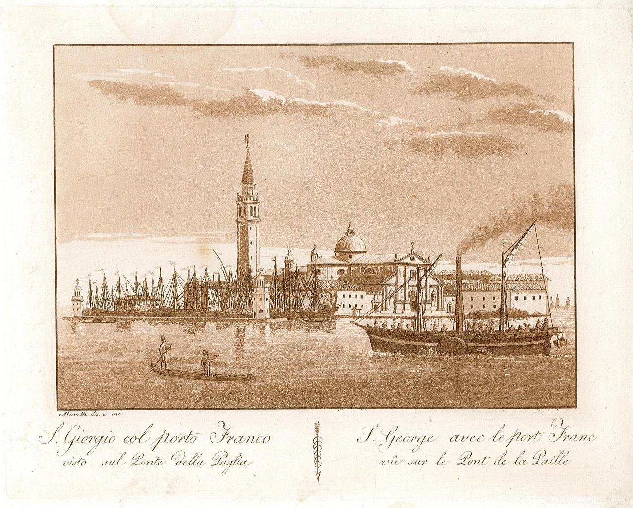 S. Giorgio col porto Franco visto sul Ponte della Paglia - Il titolo si ripete in francese sulla destra