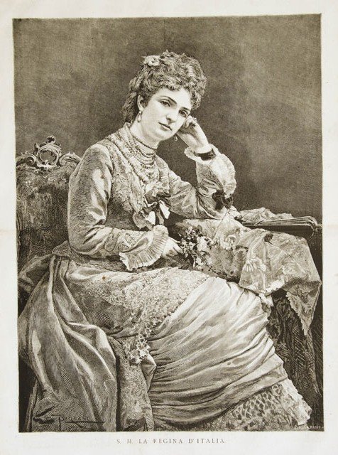 Ritratto a piena pagina della Regina d'Italia Margherita di Savoia. Piega editoriale