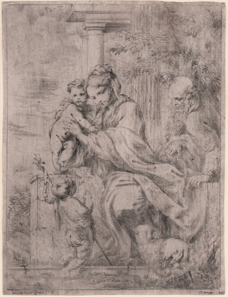 Acquaforte, 1655 circa, firmata in lastra in basso a sinistra. Esemplare nel secondo stato di due, con l’indirizzo dell’editore Daman aggiunto. Sebbene considerato un secondo stato per la presenza della firma dell’editore, l'esistenza di un primo stato ante litteram è solamente congetturata, in quanto non ne sono noti esemplari.Magnifica prova, impressa su carta vergata coeva con filigrana non identificata, rifilata al rame, leggere abrasioni in alto al centro restaurate, per il resto in ottimo stato di conservazione. Etching, 1655 circa, signed at lower left. A very good impression of the second state of two, with the Daman imprint. Trimmed to the platemark, a small scraped area at the upper right, generally in very good conditions. Cfr. Bartsch 18.