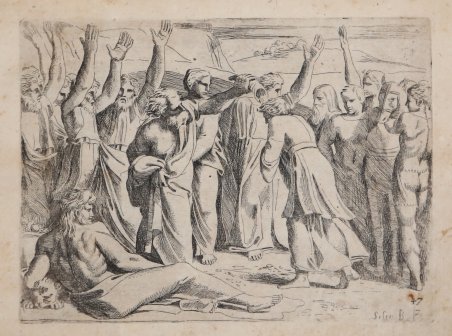 Acquaforte, circa 1607, firmata in lastra. Bellissima prova, con pieni margini, alcuni strappi nei margini bianchi dove sono presenti delle leggere gore d’acqua che non intaccano la parte incisa, per il resto in buono stato di conservazione. La tavola appartiene alla famosa Bibbia di Raffaello, incisa da Sisto Badalocchio e Giovanni Lanfranco, dal titolo Historia del Testamento Vecchio dipinta in Roma nel Vaticano da Raffaello da Urbino et intagliata in rame da Sisto Badalocchi et Giovanni Lanfranchi Parmigian. Al Sig. Annibale Carracci. In Roma appresso a Giovanni Orlandi. Con licenza de' Superiori. 1607. La serie fu realizzata intorno al 1607 a Roma, dove i due artisti erano allievi di Annibale Carracci; 28 delle tavole sono incise da Lanfranco, 23 da Badalocchio. Le opere derivano dagli affreschi di Raffaello nella loggia del Vaticano. Scrive Michael Bury in The Print in Italy, BM 2001, cat.90: “The etchings reverse Raphael's compositions. Mussini noted a tendency to simplification and alteration, especially in Badalocchio (Mussini, 1979, p.61); Borea suggested that the prints are the result of some critical reflection (1986, p.xvi). In the plate shown here, the spatial structure is substantially altered by cutting the height of the scene, making Isaac's head almost touch the top edge. This is in line with what is done in many others, by Sisto Badalocchio as well as Lanfranco. The effect is to increase the size and impact of the figures, for it is their movements and their relationships with one another that are at the centre of attention. The long dedication to Annibale Carracci reveals that the drawings had been made during the previous summer, while the Pope was away from the Vatican. Annibale's illness had prevented Badalocchio and Lanfranco from studying with him, and, keen to pursue their studies during this period, they had turned to the work of Raphael, whom Annibale always praised so much. They had now decided to publish their drawings for the benefit of young students of painting who live far away, executing them in etching 'for greater speed' ("per maggiore prestezza"). It is pointed out that not everyone has appreciated the Loggie frescoes as much as they deserve, believing them to have only been designed by Raphael; however for the variety of the inventions and for their sublime subjects they are worthy of the highest regard. Ginzburg Carignani (1996, p.130 and n.112) has shown that the preface was not in fact written by the two pupils, but by G.B.Agucchi (1570-1632) the patron and writer on art. Agucchi was a great champion of the Carracci and of Annibale in particular, seeing them as the reformers who had restored painting to the true path marked out first by the ancients and then, in modern times, by Raphael”. Plate of the Raphael Bible etched by Badalocchio and Lanfranco, titled Historia del Testamento Vecchio dipinta in Roma nel Vaticano da Raffaello da Urbino et intagliata in rame da Sisto Badalocchi et Giovanni Lanfranchi Parmigian. Al Sig. Annibale Carracci. In Roma appresso a Giovanni Orlandi. Con licenza de' Superiori. 1607. The series consists of 54 plates, a frontispiece and three etched plates with dedicatory text to Annibale Carracci and 50 plates after Raphael that are numbered from 5 to 54. The set was made when the two etchers were both young pupils of Carracci in Rome in 1607 and were said to have been made to try to lift him out of depression; 28 plates are by Lanfranco (Bartsch XVIII.345.1 to 28) and 23 (including the frontispiece) by Badalocchio (Bartsch XVIII.354.1 to 23). From Michael Bury, The Print in Italy, BM 2001, cat.90: “The etchings reverse Raphael's compositions. Mussini noted a tendency to simplification and alteration, especially in Badalocchio (Mussini, 1979, p.61); Borea suggested that the prints are the result of some critical reflection (1986, p.xvi). In the plate shown here, the spatial structure is substantially altered by cutting the height of the scene, making Isaac's head almost touch the top edge. This is in line with what is done in many others, by Sisto Badalocchio as well as Lanfranco. The effect is to increase the size and impact of the figures, for it is their movements and their relationships with one another that are at the centre of attention. The long dedication to Annibale Carracci reveals that the drawings had been made during the previous summer, while the Pope was away from the Vatican. Annibale's illness had prevented Badalocchio and Lanfranco from studying with him, and, keen to pursue their studies during this period, they had turned to the work of Raphael, whom Annibale always praised so much. They had now decided to publish their drawings for the benefit of young students of painting who live far away, executing them in etching 'for greater speed' ("per maggiore prestezza"). It is pointed out that not everyone has appreciated the Loggie frescoes as much as they deserve, believing them to have only been designed by Raphael; however for the variety of the inventions and for their sublime subjects they are worthy of the highest regard. Ginzburg Carignani (1996, p.130 and n.112) has shown that the preface was not in fact written by the two pupils, but by G.B.Agucchi (1570-1632) the patron and writer on art. Agucchi was a great champion of the Carracci and of Annibale in particular, seeing them as the reformers who had restored painting to the true path marked out first by the ancients and then, in modern times, by Raphael. Etching, printed on contemporary laid paper, with full margins showing tears at waterstains, otherwise good condition. Cfr. TIB.40.20