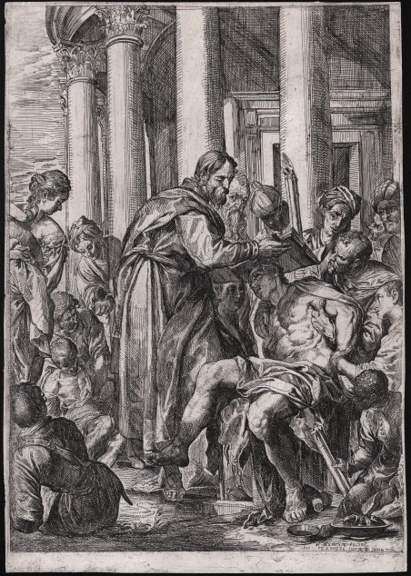 Acquaforte, 1617-25 circa, firmata in lastra in basso a destra BREBIETTE FECIT/ INVENTORE VERONESE INNOCENTE. Bellissima prova, ricca di toni, impressa su carta vergata coeva, rifilata al rame o con sottilissimi margini, piccolo restauro all’angolo superiore destro, per il resto in ottimo stato di conservazione. ' San Barnaba guarisce un malato tenendo il vangelo di San Matteo sulla testa dell'uomo. L’opera riproduce in controparte il dipinto (1566 circa) di Paolo Caliari il Veronese, dalla chiesa di San Giorgio in Braida Verona, oggi a Rouen - Musée des Beaux-Arts in quanto asportato dai napoleonici nel 1797. Nella missione apostolica che condusse a Cipro con il suo discepolo Marco, San Barnaba divenne noto per la guarigione dei malati mediante l'imposizione del Libro dei Vangeli, secondo la Leggenda Aurea. L'impressione di calore umano creata dall'anello di aiutanti intorno alla figura centrale del santo, la modernità del tempietto decentrato che crea una sensazione di rotazione intorno ai volti e il colore dei turbanti rendono il quadro chiaramente leggibile. Veronese ha portato una qualità solare al suo lavoro con colori vibranti anche nelle ombre. La scena fu dipinta per la chiesetta di San Giorgio, annessa all'ospedale dei Barnabiti nella città di Verona. L'artista tornò poi nella sua città natale, dopo aver realizzato a Venezia, insieme a Tiziano e Tintoretto, grandi opere decorative per la camera del Consiglio dei Dieci a Palazzo Ducale. L’opera sembrerebbe essere relativa al periodo italiano del Brebiette, 1617-25. Si sa relativamente poco della prima vita e della formazione artistica di Pierre Brebiette. Nel gennaio 1617 viveva a Roma, dove rimase fino al 1625. In Italia Brebiette fu strettamente associato al pittore-incisore Claude Vignon e all'editore di stampe e commerciante di quadri Francois Langlois, detto Ciartres; rimasero amici per tutta la vita. Sebbene sia stato identificato un dipinto, Brebiette fu principalmente un artista grafico, e sono noti un certo numero di bei disegni e quasi 300 stampe. La sua opera incisa include soggetti di genere, mitologici e religiosi. È probabile che Brebiette sia stato introdotto all'incisione a Roma; il suo lavoro riflette lo stile e le tecniche degli incisori italiani di quel luogo: Antonio Tempesta (1555-1630), Orazio Borgianni (circa 1578-1616) e Ottavio Leoni (1578-1630). In Italia alcune delle stampe di Brebiette riproducevano dipinti di maestri rinascimentali come Andrea del Sarto e Paolo Veronese, e di pittori romani più recenti come Cesare d'Arpino. Bibliografia P. Ticozzi, Immagini dal Veronese, Roma 1979, n. 20; Le Blanc, I, p. 513, n. 13; Inventaire du Fonds Français: Bibliothèque Nationale, Département des Estampes (46.II). Etching, 1617-25 circa, lettered lower right BREBIETTE FECIT/ VERONESE INVENTOR INNATOR. Beautiful proof, rich in tone, printed on contemporary laid paper, trimmed to copperplate or with very thin margins, small restoration to the upper right corner, otherwise in excellent condition. Saint Barnabas: he cures a sick man by holding the gospel of Saint Matthew over the man's head. ' In reverse, after the painting (c. 1566) by Paolo Caliari il Veronese, from the church of San Giorgio in Braida Verona, today in Rouen – Musée des Beaux-Arts. In the apostolic mission he led to Cyprus with his disciple Mark, Saint Barnabas became known for healing the sick by the laying on of the Book of the Gospels, according to the Golden Legend. The impression of human warmth created by the ring of helpers around the central figure of the saint, the modernity of the off-centre ' tempietto ' which creates a revolving sensation around the faces and the colour of the turbans all make for a clearly legible tableau. Veronese ' brought a solar quality to his work with vibrant colours even in the shadows. The scene was painted for the little church of San Giorgio, attached to the Barnabite hospital in the city of Verona. The artist then returned to his native city, having produced large-scale decorative works in Venice along with Titian and Tintoretto for the chamber of the Council of Ten at the Doge’s Palace. The work would appear to relate to Brebiette's Italian period, 1617-25. Relatively little is known about Pierre Brebiette's early life and artistic formation. By January 1617 he was living in Rome, where he remained until 1625. In Italy Brebiette was closely associated with the painter-etcher Claude Vignon and the print publisher and paintings dealer Francois Langlois, called Ciartres; they remained friends for life. Although one painting has been identified, Brebiette was primarily a graphic artist, and a number of fine drawings and nearly 300 prints by him are known. His etched oeuvre includes genre, mythological, and religious subjects. Brebiette was likely to have been introduced to etching in Rome; his work reflects the style and techniques of Italian etchers there: Antonio Tempesta (1555-1630), Orazio Borgianni (about 1578-1616), and Ottavio Leoni (1578-1630). In Italy some of Brebiette's prints reproduced paintings by such Renaissance masters as Andrea del Sarto and Paolo Veronese, and more recent Roman painters including Cesare d'Arpino. Bibliografia P. Ticozzi, Immagini dal Veronese, Roma 1979, n. 20; Le Blanc, I, p. 513, n. 13; Inventaire du Fonds Français: Bibliothèque Nationale, Département des Estampes (46.II). Cfr.