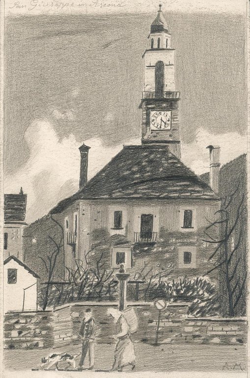 Disegno originale su carta pesante del primo '900, della chiesa in ascona nella Svizzera ticinese. Titolo in alto a sinistra firmato con monogramma A. M. in basso a destra