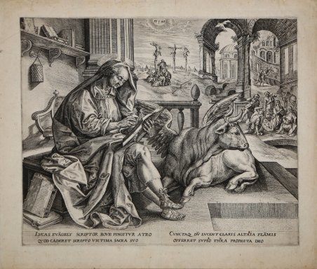 Bulino, circa 1585, da un soggetto di Martin de Vos. Esemplare nel primo stato di due, avanti il numero 3 aggunto in basso a destra.Magnifica prova, impresse su carta vergata coeva, con margini, in ottimo stato di conservazione. St Luke seated and writing the gospel besides a winged ox in his study; behind, scenes from the life of Christ with the Adoration of the shepherds and the three crosses; plate 3; after Maarten de Vos. Engraving, after Martin de Vos. A first state, before the number 3 added at lower right.Lettered in margin with two columns of Latin, each two lines "LUCAS EVAGELY . DEO".From a series of four plates (Hollstein 781-784 [de Vos]; 1115-1118 [Wierix family]).Magnificent works, printed on contemporary laid paper, with full margins, in excellent condition. Cfr. Hollstein 1117 (Wierix); Alvin 1866 661; Hollstein 783 (Maarten de Vos); Mauquoy-Hendrickx 1979 838.