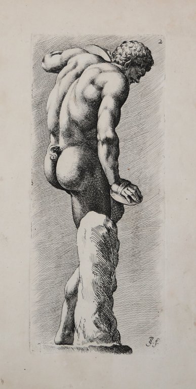 Acquaforte, 1670 circa, firmata in lastra con il monogramma. Una bella impressione, stampata su carta vergata coeva, con margini, ottime condizioni. La tavola è tratta da Signorum veterum icones, una collezione di sculture e statue romane di Jan de Bisschop (Johannes Episcopius) pubblicata per la prima volta nel 1668. Questa suite di 100 stampe di de Bisschop comprende sculture classiche conservate in collezioni olandesi e italiane nel XVII secolo. Le statue antiche erano molto apprezzate come opere d’arte, in particolare dagli artisti che ne ammiravano la loro rappresentazione di anatomia, drappeggi e pose. Questa suite comprende alcune delle sculture più importanti, da vari punti di vista, alle quali l’artista ebbe accesso. Alcune delle sculture classiche riprodotte nel Signorum veterum icones provengono dalle collezioni seicentesche di Gerrit Uylenburgh e Hendrik Scholten, alle quali de Bisschop aveva accesso diretto. La sequenza dell’opera è rigorosamente conforme alla tradizione classica: le prime illustrazioni riguardano le parti del corpo (questa sezione è stata lasciata incompiuta alla morte prematura di de Bisschop): statue complete, seguite da pose e suggerimenti per composizioni con più di una figura. Le stampe avevano lo scopo di fornire agli artisti esempi di pose ideali. Dai dipinti di Adriaen van der Werrff e Nicolaes Verkolje, è chiaro quanto siano stati influenti questi studi nello sviluppo della pittura classica olandese alla fine del XVII secolo. Etching, 1670 circa, signed on plate with the monogram. A fine impression, printed on contemporary laid paper, with margins, very good condition. The plate si taken from Signorum veterum icones, a collection of Roman sculptures & statues by Jan de Bisschop (Joh. Episcopius), first published in 1668. This suite of 100 prints by de Bisschop comprises of classical sculptures housed in Dutch and Italian collections in the seventeenth century. Ancient statues were highly regarded as works of art, in particular by artists who admired their representation of anatomy, drapery and poses. This suite includes some of the most important sculptures, from various view points, from which the artist could study. Some of the classical sculptures reproduced in de Bisschop’s Icones were from the seventeenth-century collections of Gerrit Uylenburgh and Hendrik Scholten, to which de Bisschop had direct access. The sequence of the Icones adhered strictly to the classical tradition: first the individual parts of the body were illustrated (this section was left unfinished at de Bisschop’s premature death), then completesculptures, followed by poses and suggestions for compositions with more than one figure. The prints were intended to provide artists with examples of ideal poses. From the paintings of Adriaen van der Werrff and Nicolaes Verkolje, it is clear just how influential these studies were in the development of Dutch classical painting during the late 17th century. Cfr.