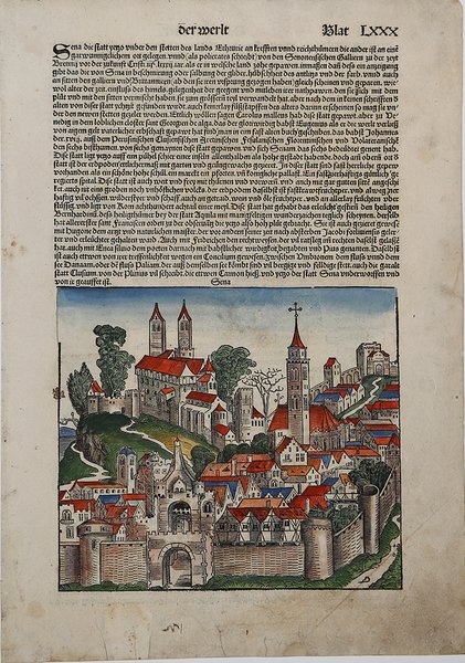 La monumentale opera di Schedel, il Liber Cronicarum, rappresenta uno “dei più straordinari lavori mai realizzati” dall’editoria del XV secolo. Gli incisori erano Michael Wolgemut, famoso maestro di Albrecht Dürer, e il figliastro Wilhelm Pleydenwurff. Wolgemut fu il tutore di Albrecht Dürer tra il 1486 e il 1490; recenti studi hanno dimostrato come Durer abbia collaborato alla realizzazione di quest’opera, poiché alcuni dei tratti hanno somiglianze stupefacenti con quelli dell’Apocalisse; alcune opere sono infatti attribuite al maestro di Norimberga. La stampa venne supervisionata dal grande stampatore Anton Koberger, le cui opere erano famose in tutta Europa. Xilografia, finemente colorata a mano, in buone condizioni. Dimensioni del foglio 305x405. Schedel's monumental Liber Cronicarum was “one of the most extraordinary works ever produced”.The woodblock cutters were Michael Wolgemut, the well-known teacher of Albrecht Dürer, and his stepson Wilhelm Pleydenwurff. Wohlgemut was Albrecht Dürer's tutor between 1486-90 and, as recent scholarship has shown, Albrecht Dürer may also have collaborated, since some of the cuts bear a remarkably close resemblance to the Apocalypse illustrations.The printing was carried out under the supervision of the great scholar-printer Anton Koberger, whose printing were famous throughout Europe. Woodcut, later hand colour, in good condition. Cfr. E. Pellegrini, "L'iconografia di Siena nelle opere a stampa", pp. 27-28