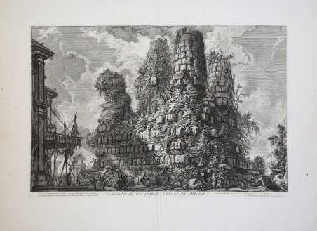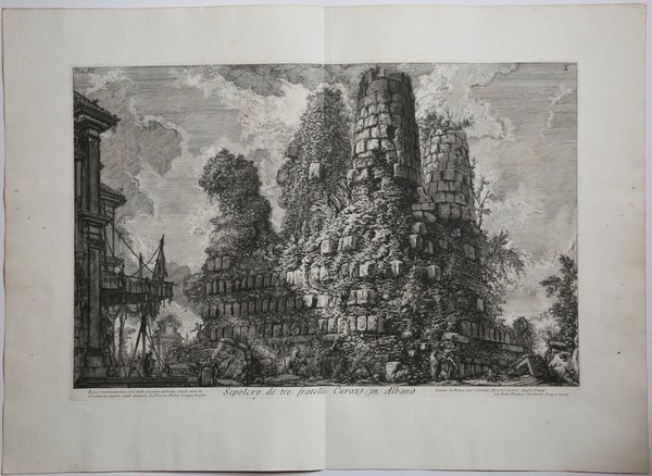 Acquaforte e bulino, 1756 circa, firmata in lastra in basso a destra. Dalla serie Le Antichità Romane. Meravigliosa prova, ricca di toni, impressa a inchiostro bruno su carta vergata coeva, con pieni margini ed in perfetto stato di conservazione. Opera tratta dalla prima edizione, pubblicata a Roma nel 1756 nella stamperia di Angelo Rotili a Palazzo Massimo alle Colonne, dai signori Bouchard e Gravier, librai e mercanti in Roma con sede presso San Marcello al Corso. La raccolta conteneva un ritratto del Piranesi, inciso da Felice Polanzani, e recava una dedica a James Caulfield conte di Charlemont, dedica poi eliminata in seguito ad un litigio. Di questa edizione originale, che venne alla luce nel maggio del 1756, sono note tre diverse tirature, connesse con le vicende del litigio con lord Charlemont, vicende documentate dal Piranesi stesso nelle sue Lettere di Giustificazione del 1757. Le diverse tirature sono riconoscibili tra loro proprio nel frontespizio del primo tomo, quello originariamente dedicato al nobile inglese, che successivamente si presenta con dedica e stemma araldico abraso, quindi con l’aggiunta di una dedica dell’autore Aevo Suo Posteri set Utilitari Publicae. Henry Focillon, nel suo saggio del 1918, suppone che il Piranesi prepari ed incida le tavole per l’opera tra il 1750 ed il 1756, tuttavia, elementi architettonici fanno risalire alcune al 1746. In realtà le tavole più antiche utilizzate nella raccolta risalgono probabilmente ad anni ancora precedenti, come sembra suggerire sia l’estrema complessità dell’opera, legata ad un lunghissimo lavoro di preparazione e ricerca, sia l’oscillazione stilistica riscontrabile comparando le varie tavole. Ad ogni modo, la grandiosità delle Antichità Romane del Piranesi non sta solamente nel grande lavoro grafico prodotto dall’artista: l’opera risulta infatti fondamentale come innovazione metodologica nel settore dell’archeologia a lei contemporanea, con l’utilizzo di scritti che sono essenziali per comprendere il pensiero dell’autore e l’innovazione del metodo piranesiano. Si può quindi sostenere, come giustamente fa notare il Focillon, che l’artista veneziano fondi l’archeologia moderna. Questa innovazione comporta, però, un enorme stacco e una grande divergenza con il pensiero e la cultura ufficiale ed accademica del periodo - di derivazione anglosassone - causando enormi polemiche di cui Piranesi fu bersaglio, e il fiorire di una negativa aneddotica intorno alla sua persona, il cui scopo era quello di ristabilire l’egemonia minacciata della cultura “classica”. Il principale pensiero espresso nelle Antichità Romane consiste nel documentare e conservare in effige un patrimonio monumentale che andava di giorno in giorno sgretolandosi, linea di condotta che andava contro l’atteggiamento culturale di amatori ed antiquari, il cui piacere era puramente estetico, non disdegnando all’occorrenza, l’asporto di frammenti anche vistosi di antichità a titolo di puro collezionismo o alla stregua di souvenir. La principale novità della sua impostazione consiste nell’unificare in un solo momento le operazioni di scavo, di rilievo, le indagini strutturali e la misurazione con lo studio delle fonti letterarie, a cui egli fa riferimento diretto. Questo momento di unificazione è rappresentato dallo studio topografico, che unito alla tecnica di rilievo, alla conoscenza dei materiali e delle tecniche antiche, allo scavo ed al sopralluogo dava luce all’archeologia, ovvero lo studio della storia antica. La tavola è la numero X del tomo III delle Antichità Romane.Meravigliosa prova, ricca di toni, impressa a inchiostro bruno su carta vergata coeva con la tipica filigrana del “doppio cerchio e giglio con lettere CB” (Robison 33), con pieni margini, in ottimo stato di conservazione. Nell'iscrizione in basso si legge : "Esso è erroneamente così detto, mentre abbiamo dagli antichii Scrittori essere stato presso la Fossa C. Etching with engraving, 1756, signed at the bottom margin. From the Antichità Romane, first edition by the French publisher Bouchard and Gravier in 1756. A great impression, printed with brown ink on contemporary laid, strong, paper, with margins, perfect conditions. The first edition of this work, in four volumes, was published in Rome in 1756 at the printing-works of Angelo Rotili at the Massimo alle Colonne Palace, by Bouchard and Gravier, book-dealers and tradesmen located in Rome near the church of St. Marcel at the Via del Corso. This collection included a portrait of Piranesi, engraved by Felice Porziani, and a dedication to James Caulfield, count of Charlemont. This dedication was later abolished in the aftermath of a quarrel, described by Piranesi in his Lettere di Giustificazione [Letters of Justification] (1757), which also gave rise to three different versions of this first original edition (May 1756). These different versions are distinguishable from the title-page of the first volume, which initially was dedicated to the Irish aristocrat, then exhibited a cancelled dedication and coat of arms and, finally, bore a Latin motto written by the artist "Aevo Suo Posteri set Utilitari Publicae". Henry Focillon, in his 1918 treatise, presumed that Piranesi prepared and engraved the plates for this collection between 1750 and 1756, although some architectural features could have a few of them dating back to 1746. Actually, the oldest plates included in this collection probably date back even further, as suggested by the extraordinary complexity of this work, due to a prolonged phase of preparation and research, together with the stylistic alterations which can be observed by comparing the different plates. The magnificence of Piranesi's Antichità Romane, however, is not only in the artist's large graphic output. Indeed, this work is of primary importance from the standpoint of methodological innovation within the framework of contemporary archaeology, with the utilisa