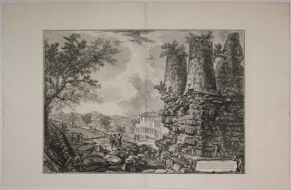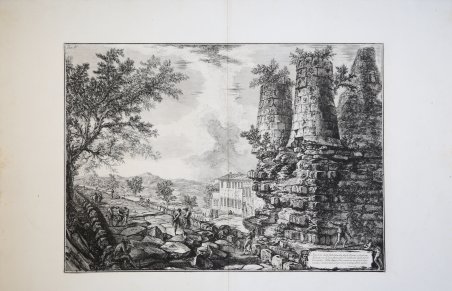 Acquaforte, tratta dalle "Antichità di Albano e di Castel Gandolfo". Magnifica prova, della prima tiratura o edizione, impressa su carta vergata coeva, con margini, in ottimo stato di conservazione. Pubblicata nel 1764, questa importante opera sulle due cittadine dei castelli romani fu commissionata al Piranesi dal papa Clemente XIII, che gli ordinò di illustrare i monumenti di Albano e Castelgandolfo e la residenza estiva dei pontefici. Stilisticamente l’opera è legato al periodo della maturità archeologica, oltre che grafica, pertanto le vedute risultano caratterizzate dall’estrema attenzione per i particolari dei monumenti, con descrizioni tecniche esatte, associate a vedute vibranti realizzate con la maestria di una varietà e molteplicità di segni grafici. Etching with engraving, from "Antichità di Albano e Castel Gandolfo", 1764. A fine impression from the early roman edition, wide margins, in very good conditions. Cfr. Focillon 513; Wilton-Ely 646