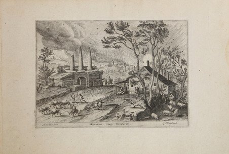Veduta tratta dalla raccolta ' Ruinarum varii prospectus, ruriumque aliquot delineationes ' pubblicata da Philip Galle con incisioni tratte da disegni di Hendrick van Cleve o Cliven III. Figlio e allievo di William van Cleve, si trasferisce in Italia nella metà del XVI secolo. Oltre ad un dipinto raffigurante una veduta di Roma, datato 1550, realizza un cospicuo numero di disegni che serviranno come modelli per l’opera incisa, realizzata al ritorno ad Anversa e pubblicata nel 1587. Le vedute, che raffigurano principalmente Roma ma anche altre città europee, recano in basso le iscrizioni “Henri. Cliven. inven.” o “Henri Cliven pingebat”, che ne attestano la derivazione, ma non l'autografia. È certo che Hendrick viaggiò in Italia. Gli studiosi non sono d'accordo sui tempi del suo soggiorno: alcuni lo collocano prima del 1551, anno in cui divenne maestro della Gilda, altri tra il 1551 e il 1555, data in cui si sposò. In Italia fece molti disegni di vedute di montagne, edifici e paesaggi urbani, che poi utilizzò nelle sue opere. Sulla base dei suoi disegni noti di città italiane, probabilmente trascorse del tempo a Roma, Firenze e Napoli. Hendrick van Cleve era un artista di paesaggio, creava sia vedute topografiche sia paesaggi immaginari. Questi sono in stile italianizzante, raffigurano ampie vedute con rovine che possono essere o meno interamente immaginarie. Le rovine sono di solito una compilazione di elementi caratteristici dell'architettura classica; alcune sono basate su rovine esistenti che possono essere identificate, altre sono costruzioni completamente di fantasia dell’artista. I disegni di Hendrik van Cleve furono, quindi, usati dai tipografi contemporanei di Anversa. Due serie di stampe, secondo i disegni di van Cleve, furono pubblicate dal famoso incisore ed editore Philips Galle. La prima serie, ' Regionem, rurium, fundormumq[ue], varii atove amoeni prospectus, pubblicata nel 1587, comprende 10 tavole che raffigurano principalmente paesaggi pastorali immaginari con rovine. Hendrik van Cleve è menzionato come disegnatore su ogni stampa e Philip Galle come incisore. La seconda serie intitolata ' Ruinarum varii prospectus, ruriumq[ue] aliquot delineationes ' non è datata, ma fu, probabilmente, pubblicata nello stesso periodo della prima. Le 38 stampe mostrano vedute mediterranee, non è chiaro chi abbia inciso questa serie. ' La firma con il monogramma di H. van Cleve appare su tutte le 38 incisioni, ad eccezione della n° 22. La firma di Philip Galle appare su tutte le incisioni mentre quella di suo figlio Theodoor si vede solo su una. Anche Hendrick van Cleve stesso potrebbe essere stato l'incisore della serie. ' Incisione al bulino, bella impressione su carta vergata coeva, in ottimo stato di conservazione. A nice view taken from the rare ' Ruinarum vari prospectus ruriumq. Aliquot delinationes. Hendrick van Cleve or Cliven III, son and pupil of William van Cleve, moved to Italy in the second half of the XVI century; besides a painting depicting a view of Rome (1550), he realized a considerable amount of drawing which he afterwards used as preparatory for the engravings he realized in Antwerp and published by Philip Galle in 1587. The views, whose main subject is Rome but there are also other European cities, bear the inscription “Henri. Cliven. Inven” or “Henri Cliven pingebat” on lower part, which testify their origin, but not necessarily the fact that he realized them. It is certain that Hendrick travelled to Italy. Scholars disagree about the timing of his stay in Italy. Some place it before 1551, the year in which he became a master of the Guild, while others place it between 1551 and 1555, the date on which he got married. In Italy he made many drawings of mountain views, buildings and cityscapes, which he later used in his works. Based on his known drawings of Italian cities, he likely spent time in Rome, Florence and Naples. Hendrick van Cleve was a landscape artist. He created topographical views as well as imaginary landscapes. His landscapes are in the Italianising style and typically depict wide views with ruins that may or may not be entirely imaginary. The ruins are usually a compilation of characteristic elements from classical architecture. Some are based on existing ruins which can be identified. Others are completely fabricated constructions Hendrik van Cleve’s drawings were used by contemporary printmakers in Antwerp as designs. Two series of prints after van Cleve's designs were published by the renowned engraver and publisher, Philips Galle. The first series, ' Regionem, rurium, fundormumq[ue], varii atove amoeni prospectus ' was published in 1587. It consists of 10 plates that mainly depict imaginary pastoral landscapes with ruins. Hendrik van Cleve is mentioned as the designer on each print and Philip Galle as the engraver. The second series entitled ' Ruinarum varii prospectus, ruriumq[ue] aliquot delineationes ' is undated but was likely published around the same time as the first one. The 38 prints show Mediterranean views. It is not clear who engraved this series. ' H. van Cleve’s signature and monogram appear on all 38 engravings with the exception of engraving n.22 of the set which lacks the monogram. Philip Galle’s signature also appears on all the engravings while that of his son Theodoor appears on engraving only. Hendrick van Cleve III may also have been the engraver as his monogram is present on the print. ' Engraving, good impression on contemporary laid paper, in very good conditions. Cfr.