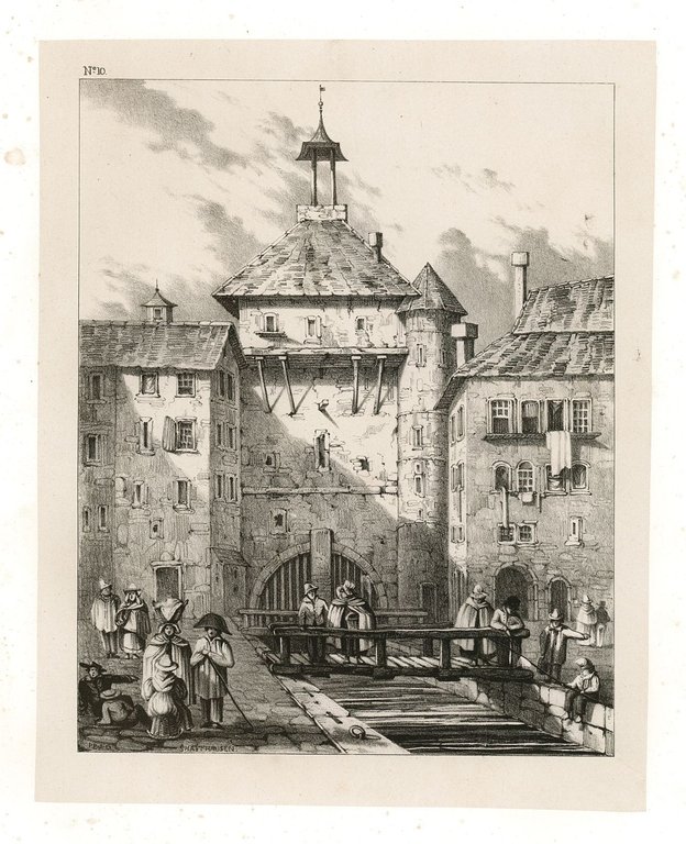 Litografia, antica ed originale stampata su carta cina, raffigurante la città di Sciaffusa. fecente parte della deliziosa raccolta di 40 litografie che ritraggono scorci e vedute di villaggi e città da Ghent a Francoforte, Verona, Bologna, Firenze, Roma e Genova, ecc. a titolo "Italy, Switzerland, Belgium. a series of original drawings on stone by I.E.A. Dolby" pubblicata a Londra nel gennaio del 1836.