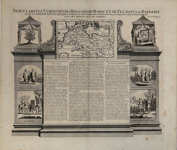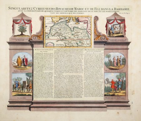 Foglio molto decorativo con vedute illustrate della gente e dei costumi della Costa di Barbaria e una piccola mappa della regione intitolata La Barbarie. Il testo al centro del foglio descrive i regni del Marocco e di Fez e le abitudini dei loro abitanti in fatto di abbigliamento, matrimonio e sepoltura. La punizione di un criminale è raffigurata in alto a destra. Foglio tratto dall'Atlas Historique, pubblicato ad Amsterdam tra il 1705 e il 1720. L'atlante, in 7 volumi, è innovativo per la sua epoca perché combina le mappe geografiche con incisioni e informazioni di carattere storico, etnografico ed araldico. Incisione in rame, finemente colorata a mano, in ottimo stato di conservazione. Henri Abraham Chatelain (1684 - 1743) era un pastore ugonotto di origini parigine. È meglio conosciuto come cartografo olandese e più specificamente per il suo contributo cartografico nell’Atlas Historique ' in sette volumi, pubblicato ad Amsterdam tra il 1705 e il 1720. Innovativo per il suo tempo, l'Atlas Historique ' combinava incisioni e opere d'arte con studi di geografia, storia, etnologia, araldica e cosmografia. Alcuni studiosi suggeriscono che l'Atlas Historique ' non fu compilato esclusivamente da Henri Chatelain, come si crede comunemente, ma piuttosto fu un'impresa familiare che coinvolse Henri, suo padre Zacharie e suo fratello, sempre Zacharie. Very decorative sheet with illustrated views of the people and customs of the Barbary Coast as well as a small map of the region entitled ' La Barbarie. The text in the center of the sheet describes the Kingdoms of Morocco and Fez and their resident's habits in dress, marriage and burials. The punishment of a criminal is depicted in the top right view. ' Taken from Atlas Historique, published in Amsterdam between 1705 and 1720. Henri Abraham Chatelain (1684 - 1743) was a Huguenot pastor of Parisian origins. He is best known as a Dutch cartographer and more specifically for his cartographic contribution in the seminal seven volume ' Atlas Historique, published in Amsterdam between 1705 and 1720. Innovative for its time, the ' Atlas Historique ' combined fine engraving and artwork with scholarly studies of geography, history, ethnology, heraldry, and cosmography. Some scholarship suggests that the ' Atlas Historique ' was not exclusively compiled by Henri Chatelain, as is commonly believed, but rather was a family enterprise involving Henri, his father Zacharie and his brother, also Zacharie. Copper engraving, fine later hand colour, in excellent condition. Cfr.