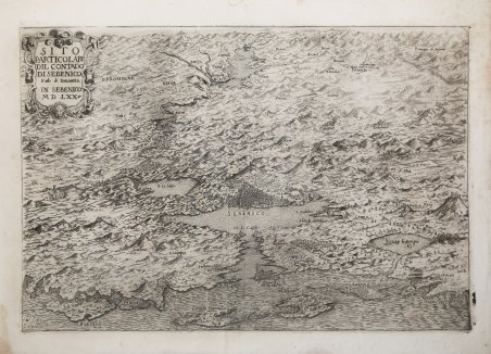 In alto a sinistra, in una targa dai bordi ornati, è impresso il titolo: SITO PARTICOLARE DIL CONTADO DI SEBENICO. Parte di DALMATIA IN SEBENICO MDLXX. In basso a sinistra, appena leggibile. Troviamo l’imprint editoriale: Ad sign: Colunt .V. Carta priva di scala grafica, orientazione e graduazione ai margini. ' Acquaforte e bulino, dimensioni mm 290x430. Esemplare di primo stato con l’imprint Ad sign: Colunt .V. chiaramente visibile e non abraso. ' Di tale tiratura si conosce il solo esemplare dell’atlante descritto da Meurer (cfr. The Strabo Illustratus Atlas, 2002, nn. 73-74) ora alla Bayerische Staatsbibliothek. ' “Carta anonima della regione di Sebenico e della Dalmazia centrale, che Meurer attribuisce al sebenicense Martino Rota, forse basandosi su quanto affermato in precedenza da Roberto Almagià: “sebbene negli esemplari da me visti non porti la firma del Rota, risale pur certamente a lui”. Dissociandoci da Meurer, per ragioni stilistiche assegniamo l’opera alla mano dell’incisore Natale Bonifacio, anch’egli originario della città dalmata. La carta ricorda infatti, in maniera molto evidente, altri prodotti cartografici del Bonifacio, in particolare, la tipologia del cartiglio. ' La peculiarità della carta è l’indirizzo in basso a sinistra Ad sign: Colunt. identificativo della tipografia di Paolo Forlani, che in questo caso potrebbe aver partecipato all’opera in qualità di editore. Il luogo di stampa indicato nel cartiglio – in Sebenico MDLXX – ci induce a credere che il Bonifacio abbia preparato la lastra nella sua città natale, o quantomeno vi avesse l’intenzione di stamparla. Sebbene non si possa escludere che esistano tirature della carta stampate a Sebenico, probabile che Bonifacio, rinunciando al suo progetto, si sia affidato poi a Forlani per la stampa. Secondo Meurer, l’opera ha una sua prova di stampa, priva dell’indirizzo del Forlani; tuttavia, sembra evidente che si tratti, in realtà, di una prova successiva, con l’indirizzo abraso e le cui tracce sono ancora visibili nella stampa” (cfr. S. Bifolco, F. Ronca, Cartografia e topografia italiana del XVI secolo, 2018: Tav. 641). ' Magnifica prova, impressa su carta vergata coeva con filigrana “scudo con scala e stella a sei punte” (Woodward nn. 244-250), con margini, in eccellente stato di conservazione. Foglio di estrema rarità, conosciuto in un solo esemplare di questa tiratura e in soli 9 esemplari istituzionali per la prova del secondo stato, con l’indirizzo abraso o parzialmente abraso: Chicago, Newberry Library; Milano, Raccolta Bertarelli; Modena, Biblioteca Estense; Monaco di Baviera, Bayerische Staatsbibliothek; Parigi, Bibliothèque Nationale; Roma, Alessandrina; Salisburgo, Universitätsbibliothek; Torino, Archivio di Stato; Venezia, Museo Correr (fonte, Cartografia e topografia italiana del XVI secolo, p. 1392). Natale Bonifacio (1538 – 1592) nacque a Sebenico, all’epoca del dominio della Repubblica di Venezia, da nobile famiglia. Poco si conosce dei primi anni della sua vita, ma intorno al 1570 lavorò a Venezia e a questo periodo appartengono numerose carte, datate tra il 1568 e il 1570, in seguito inserite nel Civitatum aliquot insignorum et locorum magis monitorum exacta delineation cum additione aliquot Insularum principalium edito da Ferrando Bertelli nel 1568, e da Donato Bertelli nel 1574. Dal 1575 fu a Roma, dove è autore di numerose incisioni. Tra queste citiamo il Cristo Benedicente, noto in tre stati (Lafreri, Duchetti e Orlandi); il Toro Farnese, dedicato ad Alessandro Farnese e edito dal Duchetti e inserito nello Speculum Romanae Magnificentiae. Le opere da lui incise recano spesso solo la sigla N.B.f(ecit); in altre, come la carta della Calabria di Prospero Parisio (1589), si firma invece Natalis Bonifacius Sabenice incidebat Romae. Paolo Forlani (attivo a Venezia tra il 1560 e il 1574), nasce a Verona, probabilmente nella terza decade del XVI secolo. Già da gi. In the upper left, in a plate with ornate borders, is engraved the title: SITO PARTICOLARE DIL CONTADO DI SEBENICO. Part of DALMATIA IN SEBENICO MDLXX. In the lower left corner, barely legible. We find the editorial imprint: Ad sign: Colunt .V. Map without graphic scale, orientation and graduation in the margins. ' Etching and engraving, dimensions 290x430 mm. First state, with the imprint Ad sign: Colunt .V. clearly visible and not abraded. ' Of this first state, only one example is known from the atlas described by Meurer (see The Strabo Illustratus Atlas, 2002, nos. 73-74) now in the Bayerische Staatsbibliothek. ' An anonymous map of the region of Sibenik and central Dalmatia, which Meurer attributes to Martino Rota from Sibenik, perhaps based on what Roberto Almagià had previously stated: "although in the specimens I have seen it does not bear Rota's signature, it certainly belongs to him". Disassociating ourselves from Meurer, for stylistic reasons we assign the work to the hand of engraver Natale Bonifacio, who was also a native of the Dalmatian city. The map is in fact very reminiscent of other cartographic products of Bonifacio, in particular the type of cartouche. The peculiarity of this work is the address at lower left Ad sign: Colunt. identifying the printing house of Paolo Forlani, who in this case may have participated in the work as publisher. The place of printing indicated in the cartouche - in Sebenico MDLXX - leads us to believe that Bonifacio prepared the plate in his native city, or at least had the intention of printing it there. Although we cannot exclude that there is an early issue printed in Sibenik; it is probable that Bonifacio, having given up his project, then entrusted Forlani with the printing. ' According to Meurer, the work has its own proof, lacking Forlani's address; however, it seems clear that it is, in fact, a later proof, with the address abraded and whose traces are still visible in the print (cf. S. Bifolco, F. Ronca, Cartografia e topografia
