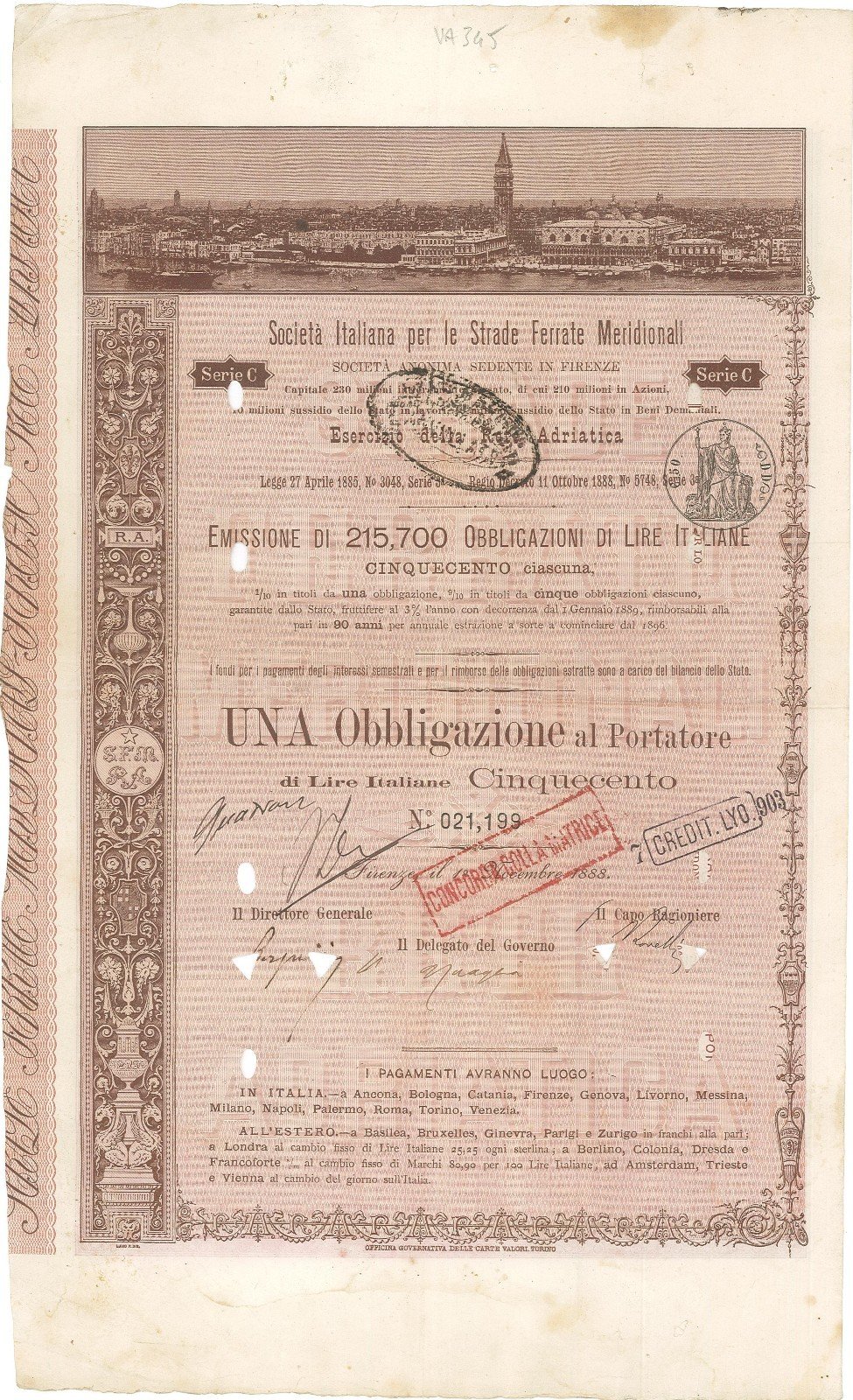 Una Obligazione al Portatore di lire italiane Cinquecento ciscuna per l'esercizio della rete Adriatica