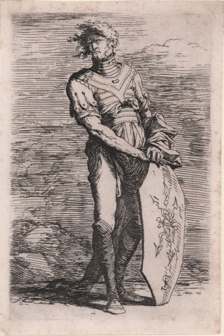 Acquaforte e puntasecca, 1656/8 circa, monogrammata in lastra. Della serie conosciuta come ' Diverse Figure. Bellissima prova, ricche di toni, impressa su carta vergata coeva, con sottili margini, in eccellente stato di conservazione. Esemplare in secondo stato, tutte con il monogramma; le prove di primo stato, ove esistano, sono senza monogramma e note in un solo esemplare. Conosciuta con il nome di ' Diverse Figure ' o ' Figurine, rappresentano senza dubbio l’opera grafica più famosa di Salvator Rosa. Già in epoca era considerata un modello per i giovani artisti, e venne più volte copiata sia in Italia che all’estero. Nelle figure dei soldati in costumi esotici oppure d’invenzione il Rosa svolge un tema trattato da molti incisori quali Callot, Della Bella e Filippo Liagno, con il quale aveva un rapporto stretto, e tramite il quale probabilmente arrivò a conoscere i soggetti dei lanzichenecchi del XV secolo di Dürer e Urs Graf. ' Una lettera dell’artista all’amico Ricciardi datata 1656 permette di datare la serie con sicurezza la periodo 1656/8. Bartsch elenca l’opera composta da 61 stampe, mentre Rotili e Wallace descrivano alcune rare variante dei soggetti, poi mai inserite nella serie, portando il numero delle Figurine a 72. Etching and drypoint, circa 1656/8, monogrammed in plate. From the series known as ' Diverse Figure. Beautiful proof, rich in tone, impressed on contemporary laid paper, with thin margins, in excellent condition. Example of the second state, sjowing the Rosa’s monogram; first-state proofs, where they exist, are unmonogrammed and known in only one copy. Known as ' Diverse Figure ' or ' Figurine, they are without doubt the most famous graphic work of Salvator Rosa. Already at that time it was considered a model for young artists, and was copied several times both in Italy and abroad. In the figures of soldiers in exotic or invented costumes, Rosa develops a theme treated by many engravers such as Callot, Della Bella and Filippo Liagno, with whom he had a close relationship, and through whom he probably came to know the subjects of the fifteenth-century Lansquenets by Dürer and Urs Graf. A letter from the artist to his friend Ricciardi dated 1656 allows the series to be dated with certainty to the period 1656/8. Bartsch lists the work as consisting of 61 prints, while Rotili and Wallace describe some rare variants of the subjects, later never included in the series, bringing the number of Figurine to 72. Cfr. Bartsch 30 stato unico; Wallace 13 stato unico.