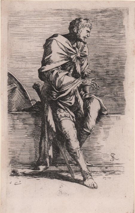 Acquaforte e puntasecca, 1656/8 circa, monogrammata in lastra. Della serie conosciuta come Diverse Figure. Bellissima prova, ricche di toni, impressa su carta vergata coeva, con sottili margini, in eccellente stato di conservazione. Esemplare in secondo stato, tutte con il monogramma; le prove di primo stato, ove esistano, sono senza monogramma e note in un solo esemplare. Conosciuta con il nome di Diverse Figure o Figurine, rappresentano senza dubbio l’opera grafica più famosa di Salvator Rosa. Già in epoca era considerata un modello per i giovani artisti, e venne più volte copiata sia in Italia che all’estero. Nelle figure dei soldati in costumi esotici oppure d’invenzione il Rosa svolge un tema trattato da molti incisori quali Callot, Della Bella e Filippo Liagno, con il quale aveva un rapporto stretto, e tramite il quale probabilmente arrivò a conoscere i soggetti dei lanzichenecchi del XV secolo di Dürer e Urs Graf. ' Una lettera dell’artista all’amico Ricciardi datata 1656 permette di datare la serie con sicurezza la periodo 1656/8. Bartsch elenca l’opera composta da 61 stampe, mentre Rotili e Wallace descrivano alcune rare variante dei soggetti, poi mai inserite nella serie, portando il numero delle Figurine a 72. Etching and drypoint, circa 1656/8, monogrammed in plate. From the series known as ' Diverse Figure. Beautiful proof, rich in tone, impressed on contemporary laid paper, with thin margins, in excellent condition. Example of the second state, sjowing the Rosa’s monogram; first-state proofs, where they exist, are unmonogrammed and known in only one copy. Known as ' Diverse Figure ' or ' Figurine, they are without doubt the most famous graphic work of Salvator Rosa. Already at that time it was considered a model for young artists, and was copied several times both in Italy and abroad. In the figures of soldiers in exotic or invented costumes, Rosa develops a theme treated by many engravers such as Callot, Della Bella and Filippo Liagno, with whom he had a close relationship, and through whom he probably came to know the subjects of the fifteenth-century Lansquenets by Dürer and Urs Graf. A letter from the artist to his friend Ricciardi dated 1656 allows the series to be dated with certainty to the period 1656/8. Bartsch lists the work as consisting of 61 prints, while Rotili and Wallace describe some rare variants of the subjects, later never included in the series, bringing the number of Figurine to 72. Cfr. Bartsch 29 II/II; Wallace 12 II/II.
