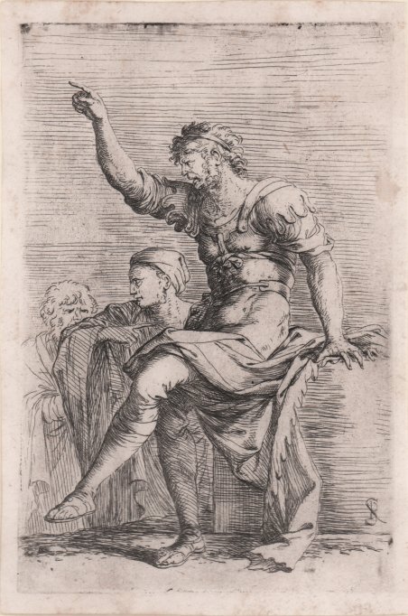 Acquaforte e puntasecca, 1656/8 circa, monogrammata in lastra. Della serie conosciuta come ' Diverse Figure. Bellissima prova, ricche di toni, impressa su carta vergata coeva, con sottili margini, in eccellente stato di conservazione. Esemplare in secondo stato, tutte con il monogramma; le prove di primo stato, ove esistano, sono senza monogramma e note in un solo esemplare. Conosciuta con il nome di ' Diverse Figure ' o ' Figurine, rappresentano senza dubbio l’opera grafica più famosa di Salvator Rosa. Già in epoca era considerata un modello per i giovani artisti, e venne più volte copiata sia in Italia che all’estero. Nelle figure dei soldati in costumi esotici oppure d’invenzione il Rosa svolge un tema trattato da molti incisori quali Callot, Della Bella e Filippo Liagno, con il quale aveva un rapporto stretto, e tramite il quale probabilmente arrivò a conoscere i soggetti dei lanzichenecchi del XV secolo di Dürer e Urs Graf. ' Una lettera dell’artista all’amico Ricciardi datata 1656 permette di datare la serie con sicurezza la periodo 1656/8. Bartsch elenca l’opera composta da 61 stampe, mentre Rotili e Wallace descrivano alcune rare variante dei soggetti, poi mai inserite nella serie, portando il numero delle Figurine a 72. Etching and drypoint, circa 1656/8, monogrammed in plate. From the series known as ' Diverse Figure. Beautiful proof, rich in tone, impressed on contemporary laid paper, with thin margins, in excellent condition. Example of the second state, sjowing the Rosa’s monogram; first-state proofs, where they exist, are unmonogrammed and known in only one copy. Known as ' Diverse Figure ' or ' Figurine, they are without doubt the most famous graphic work of Salvator Rosa. Already at that time it was considered a model for young artists, and was copied several times both in Italy and abroad. In the figures of soldiers in exotic or invented costumes, Rosa develops a theme treated by many engravers such as Callot, Della Bella and Filippo Liagno, with whom he had a close relationship, and through whom he probably came to know the subjects of the fifteenth-century Lansquenets by Dürer and Urs Graf. A letter from the artist to his friend Ricciardi dated 1656 allows the series to be dated with certainty to the period 1656/8. Bartsch lists the work as consisting of 61 prints, while Rotili and Wallace describe some rare variants of the subjects, later never included in the series, bringing the number of Figurine to 72. Cfr. Bartsch 58 II/II; Wallace 55 II/II.