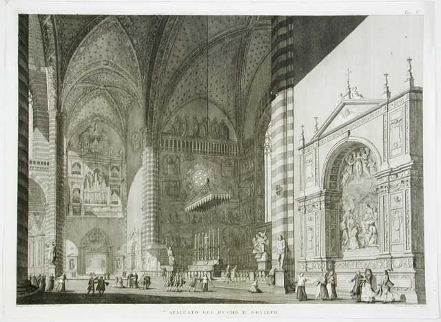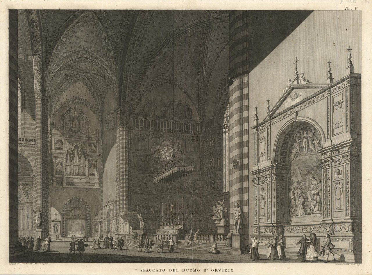 Spaccato dell'interno del duomo: l'organo del sedicesimo secolo, l'altare e la cappella della natività adiacente. tratta dall'opera "Stampe del Duomo di Orvieto dedicate alla Santità di nostro Signore Pio Sesto pontefice massimo" edita in Roma MDCCXCI. Autore: Pronti Domenico inc. & Giuseppe Barbieri del. Luogo: Orvieto. Anno: 1791. Tecnica: incisione in rame. Dimensioni: 462x647 mm.