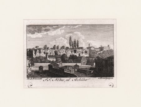 Veduta tratta dalla celebre ' Raccolta di num. 320 Vedute sì antiche, che moderne della città di Roma. …Incise a bulino in N. 80 rami, In Roma Nella Calcografia di Agapito Franzetti a Torsanguigna Col Permesso. ' L’opera si compone di un frontespizio calcografico e di 80 tavole numerate, ognuna composta da quattro vedute. Viene stampata senza data; molti repertori la datano intorno al 1790 circa, forse perché stampata su carta vergata. Una datazione intorno al 1800 ci sembra tuttavia più plausibile. ' Agapito Franzetti, calcografo attivo a Roma con bottega tra via del Corso e Torsanguigna, è noto per le sue piccole incisioni di veduta che servivano spesso come biglietti da visita. Tutte contengono, infatti, una linea in basso, dove si poteva apporre il proprio nome ad inchiostro. Come indicato nel titolo, le vedute raffigurano sia monumenti e antiche rovine che vedute “moderne”, con piazze, chiese e ville. Ciascuna tavola reca, in basso al centro, il nome dell’incisore. Gli artisti coinvolti sono sei: Jean-Jerome Baugean; Antonio Giuseppe Barbazza; Giovanni Battista Cipriani; Francesco Morelli; Antonio Poretta e Domenico Pronti. Molte delle vedute derivano dalla celebre opera di Giuseppe Vasi, ' Delle magnificenze di Roma antica e moderna. Pubblicata in 10 volumi dal 1747 al 1761, l’opera presenta 238 incisioni in rame, ciascuna incisione con testo narrativo che fornisce informazioni storiche e documentarie. ' Acquaforte, in buono stato di conservazione. ' Bibliografia: A. Bertarelli, H. Prior, ' Il biglietto da visita italiano. Cintributo alla storia del costume e dell'incisione nel secolo XVII, Bergamo 1911, p. 162. View of the city printed in Rome by the publisher Agapito Franzetti. Taken from Raccolta di num. 320 Vedute sì antiche, che moderne della città di Roma. …Incise a bulino in N. 80 rami, In Roma Nella Calcografia di Agapito Franzetti a Torsanguigna Col Permesso. ' The work consists of an intaglio frontispiece and 80 numbered plates, each consisting of four views. It is printed without date; many repertories date it around 1790, perhaps because it was printed on laid paper. A date around 1800 seems more plausible. Franzetti, a chalcographer working in Rome with a workshop between Via del Corso and Torsanguigna, is known for his small engravings of views that were often used as business cards. They all contain a line at the bottom where one's name could be written in ink. The small views were often printed four to a sheet. As indicated in the title, the views depict both monuments and ancient ruins and "modern" views, with squares, churches and villas. Each table bears, at the bottom center, the name of the engraver. There are six artists involved: Jean-Jerome Baugean; Antonio Giuseppe Barbazza; Giovanni Battista Cipriani; Francesco Morelli; Antonio Poretta and Domenico Pronti. ' The views are made after Giuseppe Vasi’s monumental work Delle magnificenze di Roma antica e moderna. Published in 10 volumes from 1747 to 1761, the work features 238 copper engravings, each engraving with a narrative text that provides historical and documentary information. Bibliografia: A. Bertarelli, H. Prior, Il biglietto da visita italiano. Contributo alla storia del costume e dell'incisione nel secolo XVII, Bergamo 1911, p. 162. Cfr.