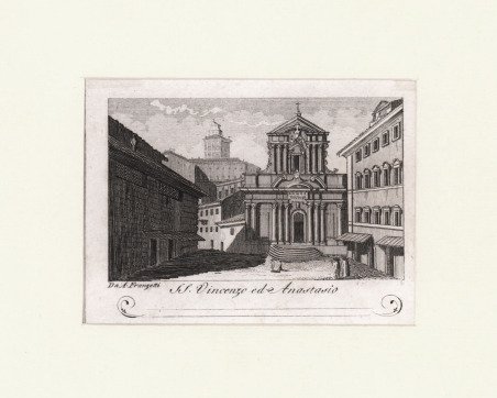 Veduta tratta dalla celebre Raccolta di num. 320 Vedute sì antiche, che moderne della città di Roma. …Incise a bulino in N. 80 rami, In Roma Nella Calcografia di Agapito Franzetti a Torsanguigna Col Permesso. ' L’opera si compone di un frontespizio calcografico e di 80 tavole numerate, ognuna composta da quattro vedute. Viene stampata senza data; molti repertori la datano intorno al 1790 circa, forse perché stampata su carta vergata. Una datazione intorno al 1800 ci sembra tuttavia più plausibile. ' Agapito Franzetti, calcografo attivo a Roma con bottega tra via del Corso e Torsanguigna, è noto per le sue piccole incisioni di veduta che servivano spesso come biglietti da visita. Tutte contengono, infatti, una linea in basso, dove si poteva apporre il proprio nome ad inchiostro. Come indicato nel titolo, le vedute raffigurano sia monumenti e antiche rovine che vedute “moderne”, con piazze, chiese e ville. Ciascuna tavola reca, in basso al centro, il nome dell’incisore. Gli artisti coinvolti sono sei: Jean-Jerome Baugean; Antonio Giuseppe Barbazza; Giovanni Battista Cipriani; Francesco Morelli; Antonio Poretta e Domenico Pronti. Molte delle vedute derivano dalla celebre opera di Giuseppe Vasi, Delle magnificenze di Roma antica e moderna. Pubblicata in 10 volumi dal 1747 al 1761, l’opera presenta 238 incisioni in rame, ciascuna incisione con testo narrativo che fornisce informazioni storiche e documentarie. ' Acquaforte, in buono stato di conservazione. ' Bibliografia: A. Bertarelli, H. Prior, Il biglietto da visita italiano. Contributo alla storia del costume e dell'incisione nel secolo XVII, Bergamo 1911, p. 162. View of the city printed in Rome by the publisher Agapito Franzetti. Taken from Raccolta di num. 320 Vedute sì antiche, che moderne della città di Roma. …Incise a bulino in N. 80 rami, In Roma Nella Calcografia di Agapito Franzetti a Torsanguigna Col Permesso. ' The work consists of an intaglio frontispiece and 80 numbered plates, each consisting of four views. It is printed without date; many repertories date it around 1790, perhaps because it was printed on laid paper. A date around 1800 seems more plausible. Franzetti, a chalcographer working in Rome with a workshop between Via del Corso and Torsanguigna, is known for his small engravings of views that were often used as business cards. They all contain a line at the bottom where one's name could be written in ink. The small views were often printed four to a sheet. As indicated in the title, the views depict both monuments and ancient ruins and "modern" views, with squares, churches and villas. Each table bears, at the bottom center, the name of the engraver. There are six artists involved: Jean-Jerome Baugean; Antonio Giuseppe Barbazza; Giovanni Battista Cipriani; Francesco Morelli; Antonio Poretta and Domenico Pronti. ' The views are made after Giuseppe Vasi’s monumental work Delle magnificenze di Roma antica e moderna. Published in 10 volumes from 1747 to 1761, the work features 238 copper engravings, each engraving with a narrative text that provides historical and documentary information. ' Bibliografia: A. Bertarelli, H. Prior, Il biglietto da visita italiano. Contributo alla storia del costume e dell'incisione nel secolo XVII, Bergamo 1911, p. 162. Cfr.