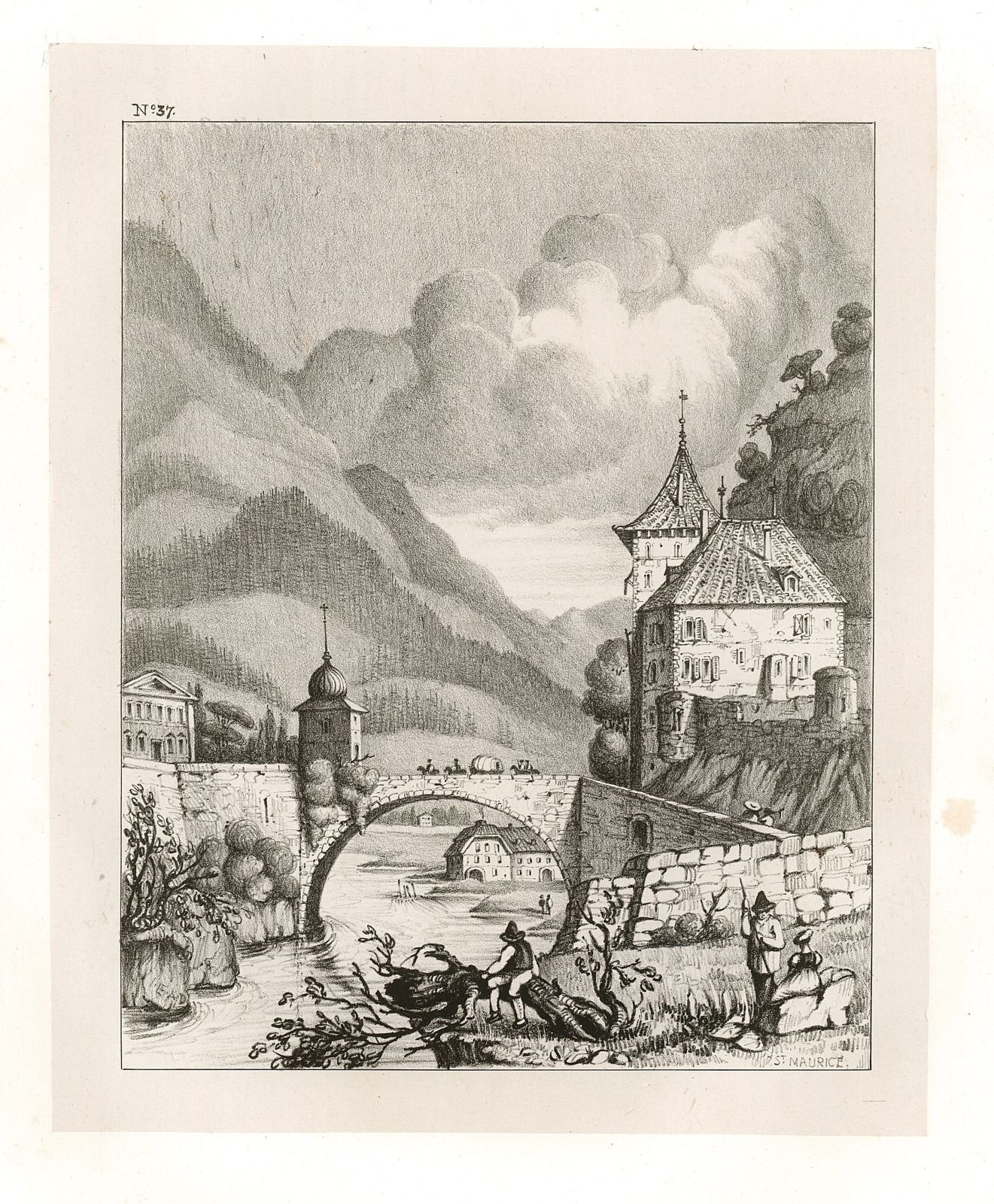 Litografia, antica ed originale stampata su carta cina, raffigurante l'antico borgo di Saint-Maurice nel Vallese. fecente parte della deliziosa raccolta di 40 litografie che ritraggono scorci e vedute di villaggi e città da Ghent a Francoforte, Verona, Bologna, Firenze, Roma e Genova, ecc. a titolo "Italy, Switzerland, Belgium. a series of original drawings on stone by I.E.A. Dolby" pubblicata a Londra nel gennaio del 1836.